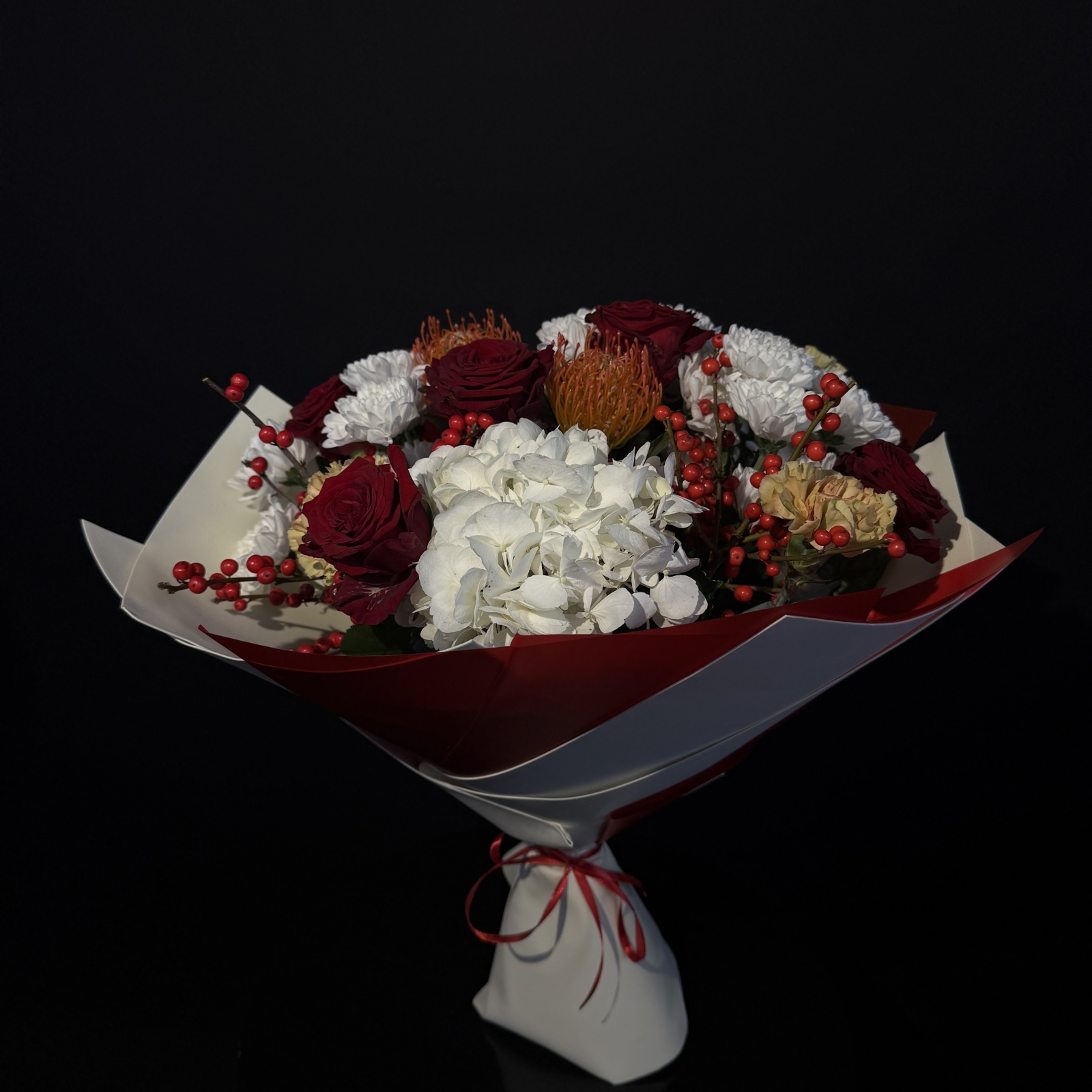 Состав: роза 5, хризантема кустовая 4, гвоздика 3, гортензия 1 и прочее. в наличии