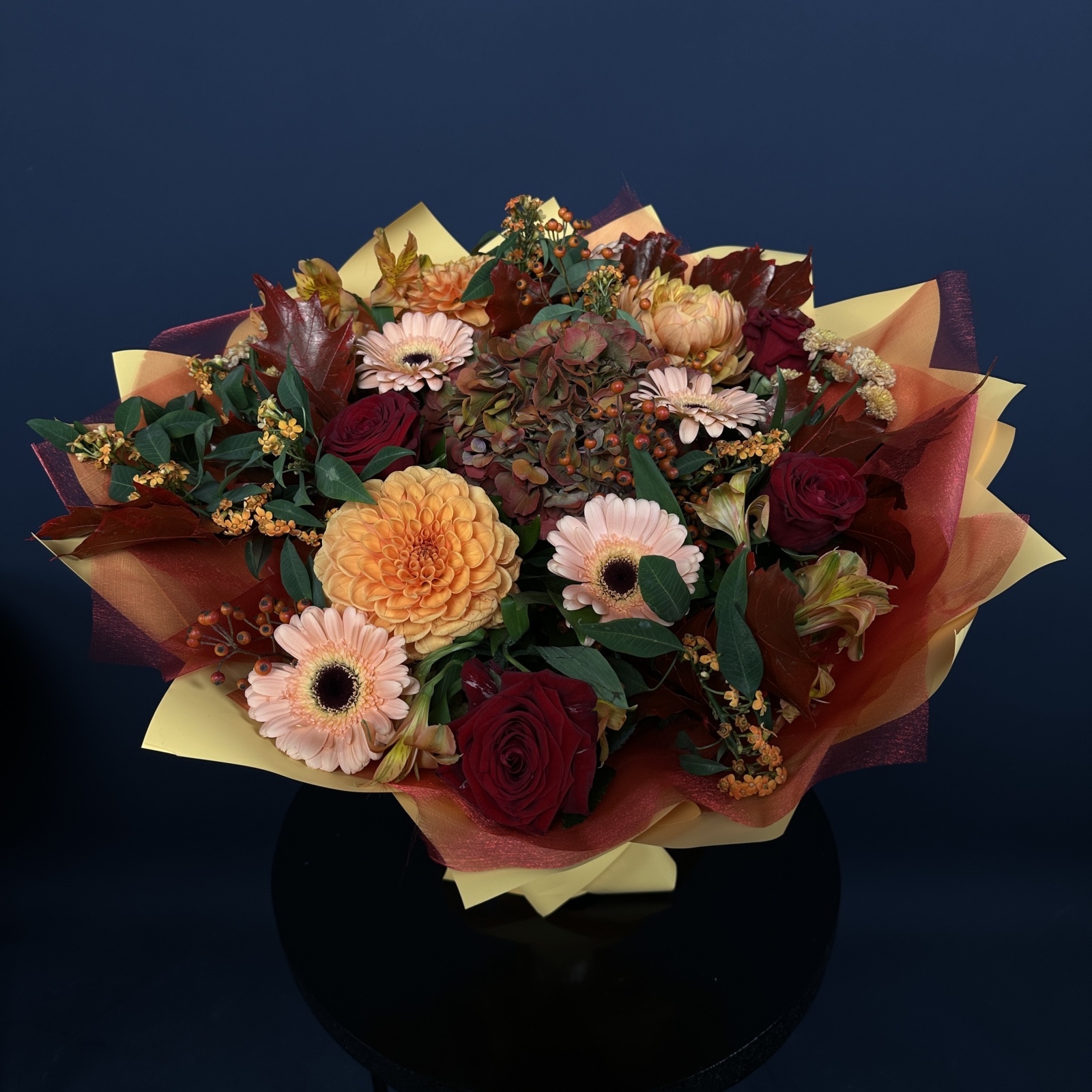 Состав: роза 5, гербера 5, хризантема 4, альстромерия 3, гортензия 1, рускус 0,5 и прочее. под заказ