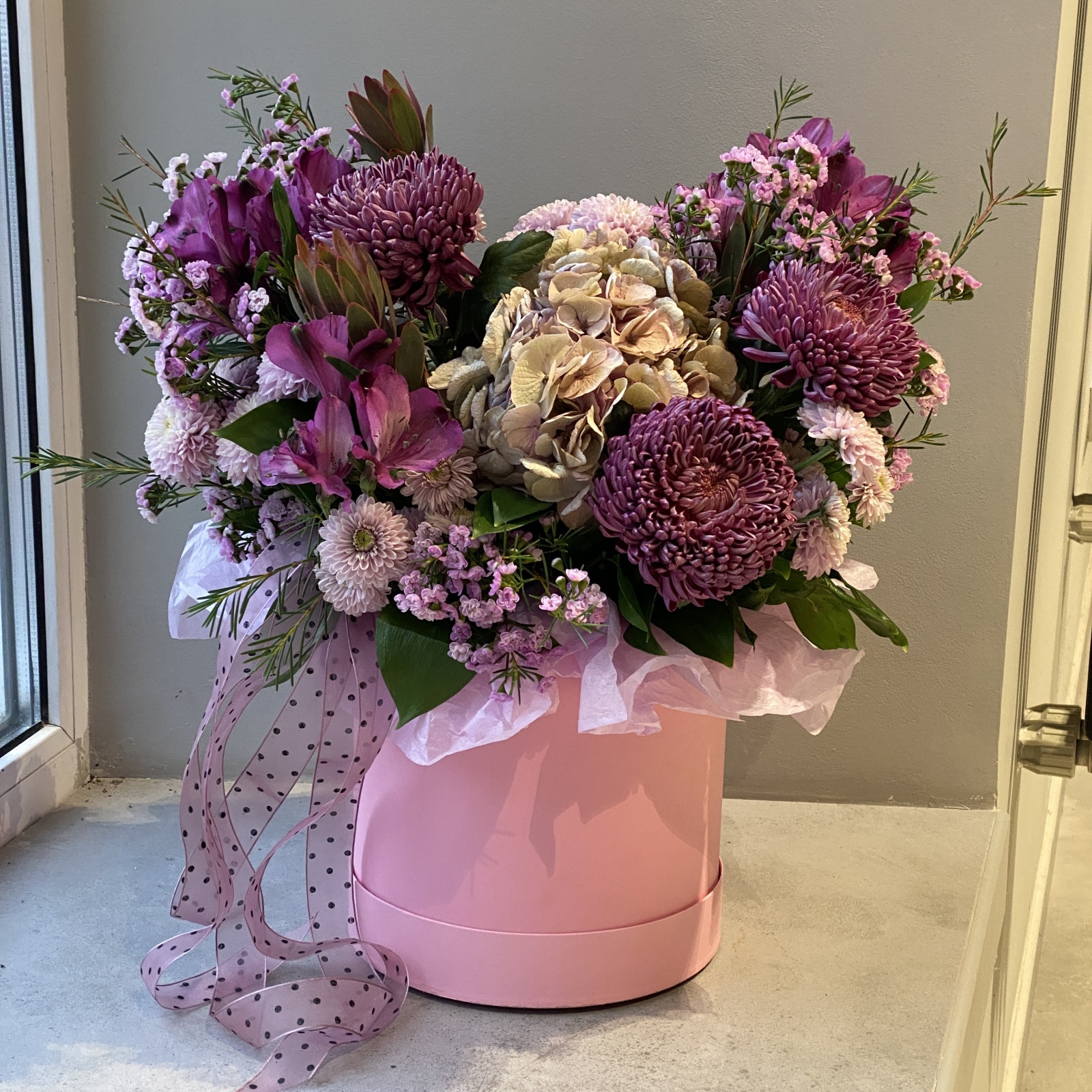 Состав: хризантема 3, альстромерия 3, хризантема кустовая 3, леукадендрон 3, хамелациум 1, гортензия 1, рускус 0,2 и прочее.                    под заказ