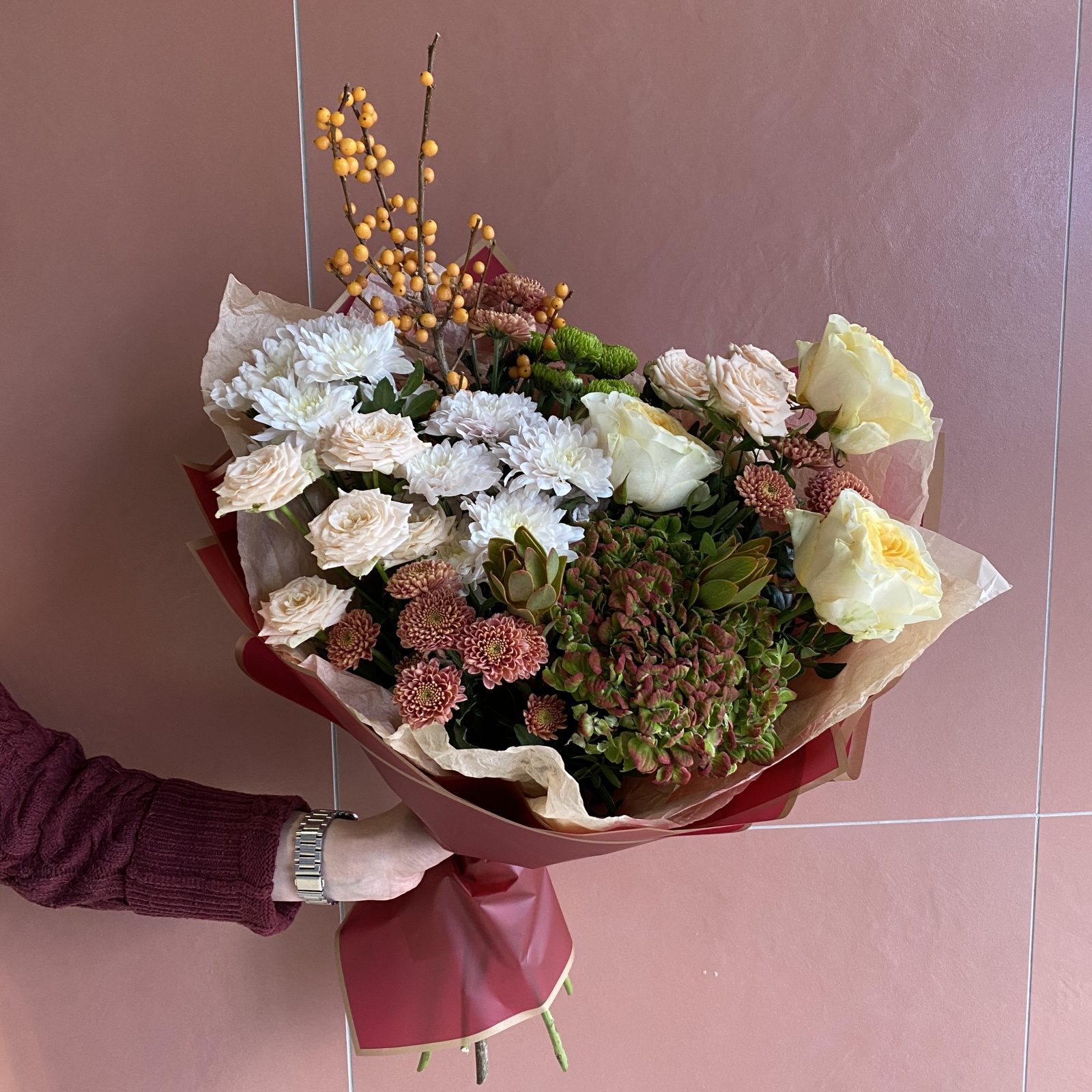 Состав: хризантема 3, роза 3, хризантема кустовая 3, роза кустовая 2, леукадендрон 2, гортензия 1, фисташка 0,5 и прочее. под заказ