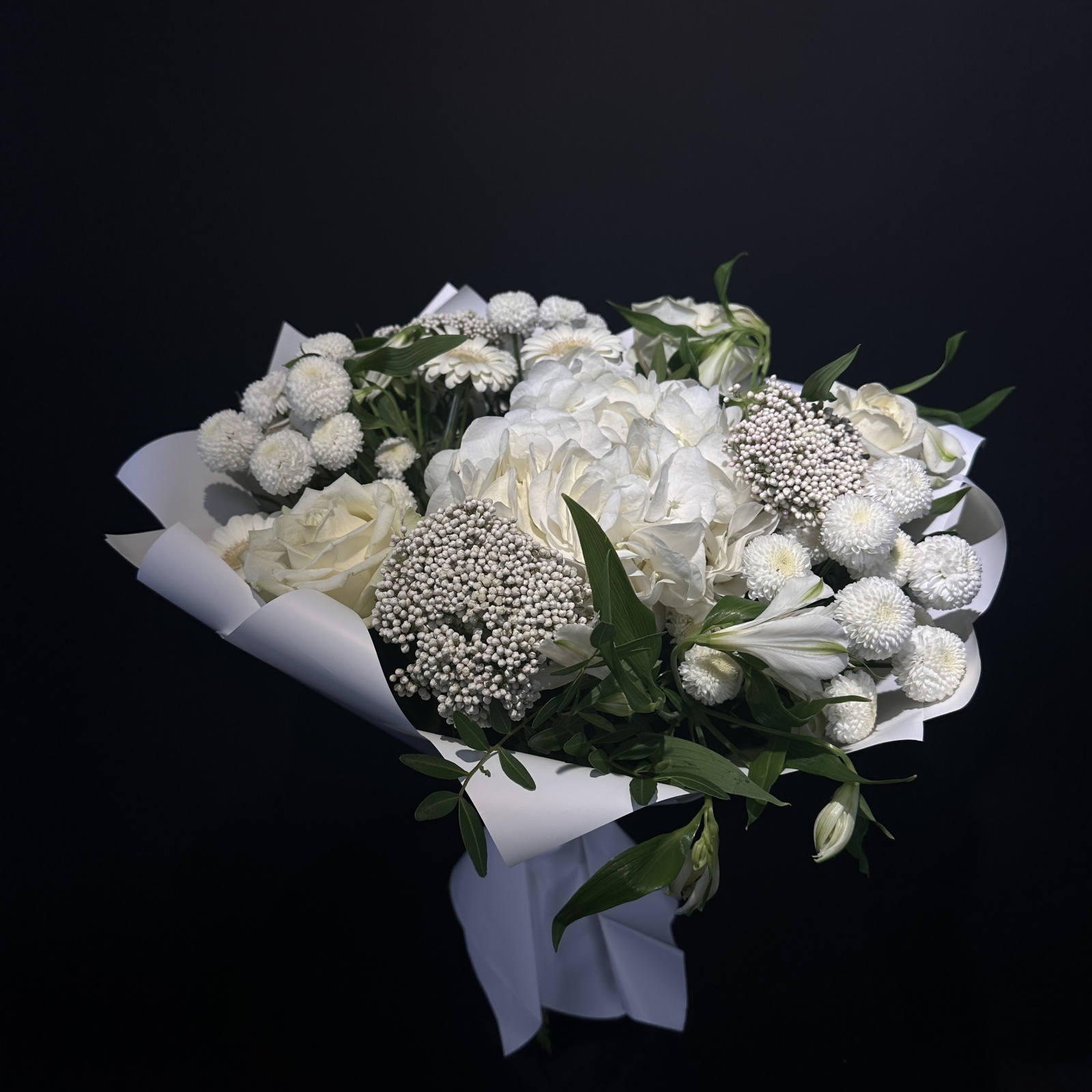 Состав: роза 4, альстромерия 3, хризантема кустовая 3, гербера 3, фисташка 0,5 и прочее. в наличии