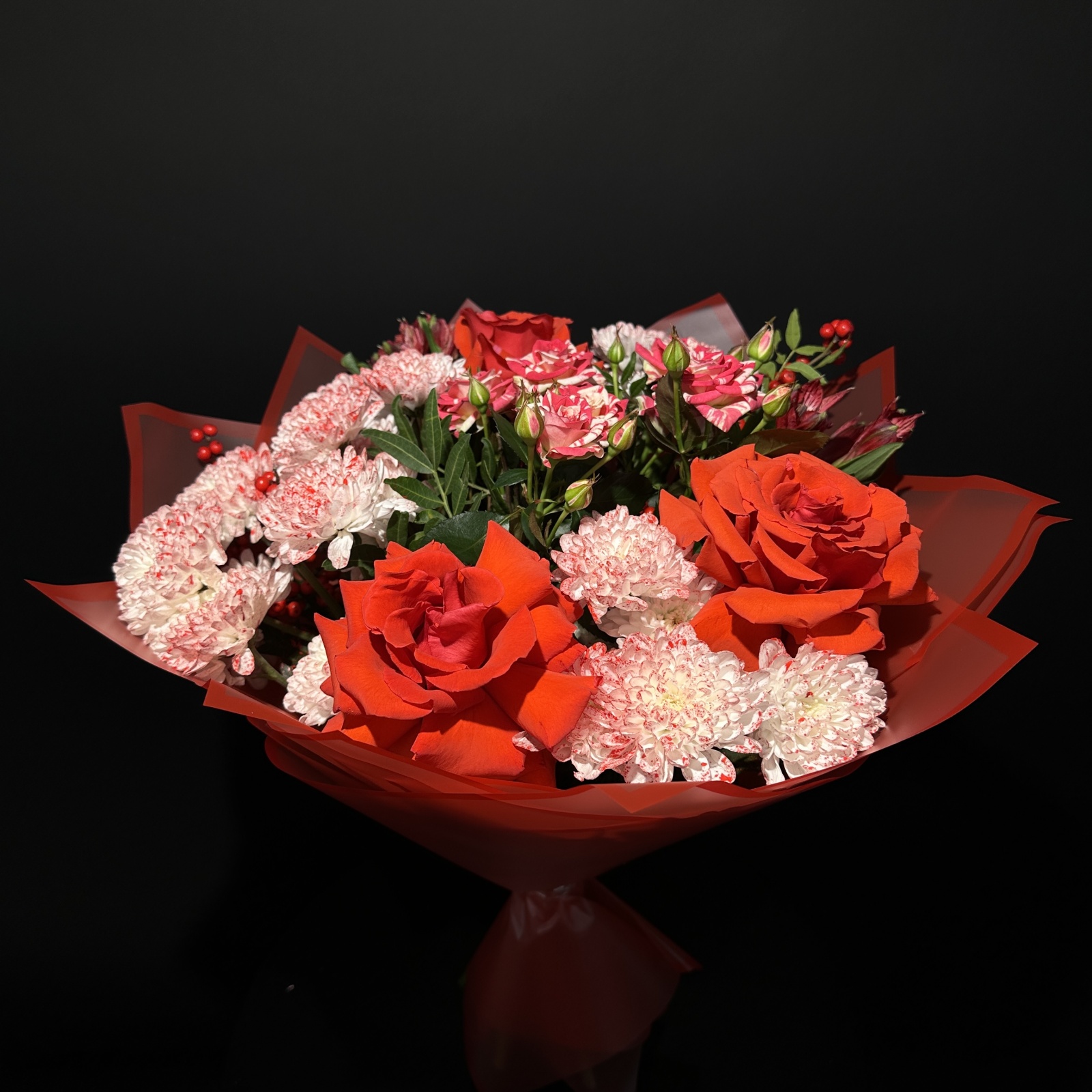 Состав: роза 4, хризантема кустовая 4, альстромерия 2, роза кустовая 1, клематис 1, фисташка 0,5 и прочее.