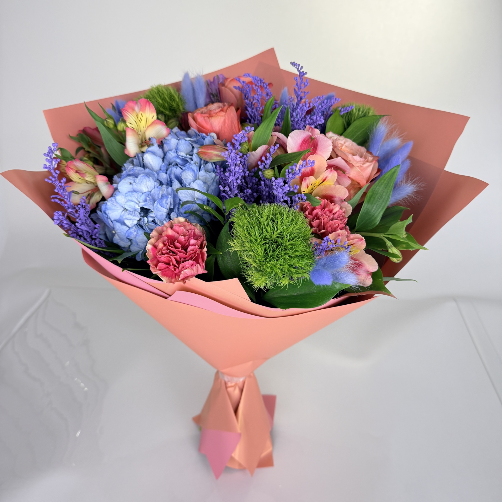Состав: роза 6, гвоздика 6, альстромерия 3, солидаго 2, эвкалипт 1, гортензия 1 и прочее. под заказ
