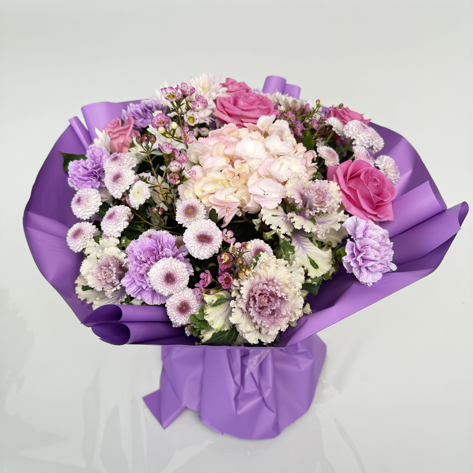 Состав: роза 6, хризантема кустовая 6, гвоздика 5, хамелациум 4, гортензия 1, рускус 0,5 и прочее. под заказ