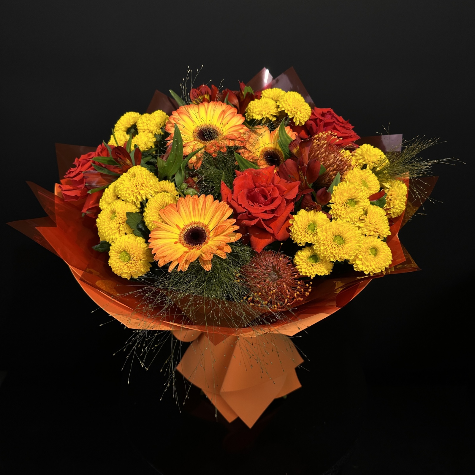 Состав: хризантема кустовая 4, гербера 3, роза 3, альстромерия 3, леукадендрон 2 и прочее. в наличии