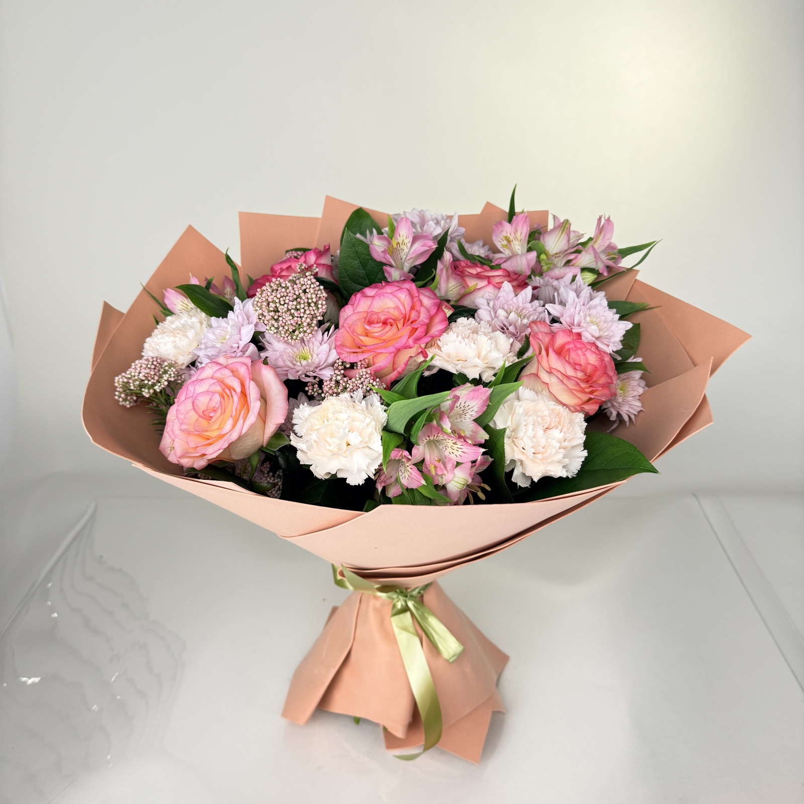 Состав: роза 6, гвоздика 5, хризантема кустовая 3, альстромерия 3 и прочее. в наличии