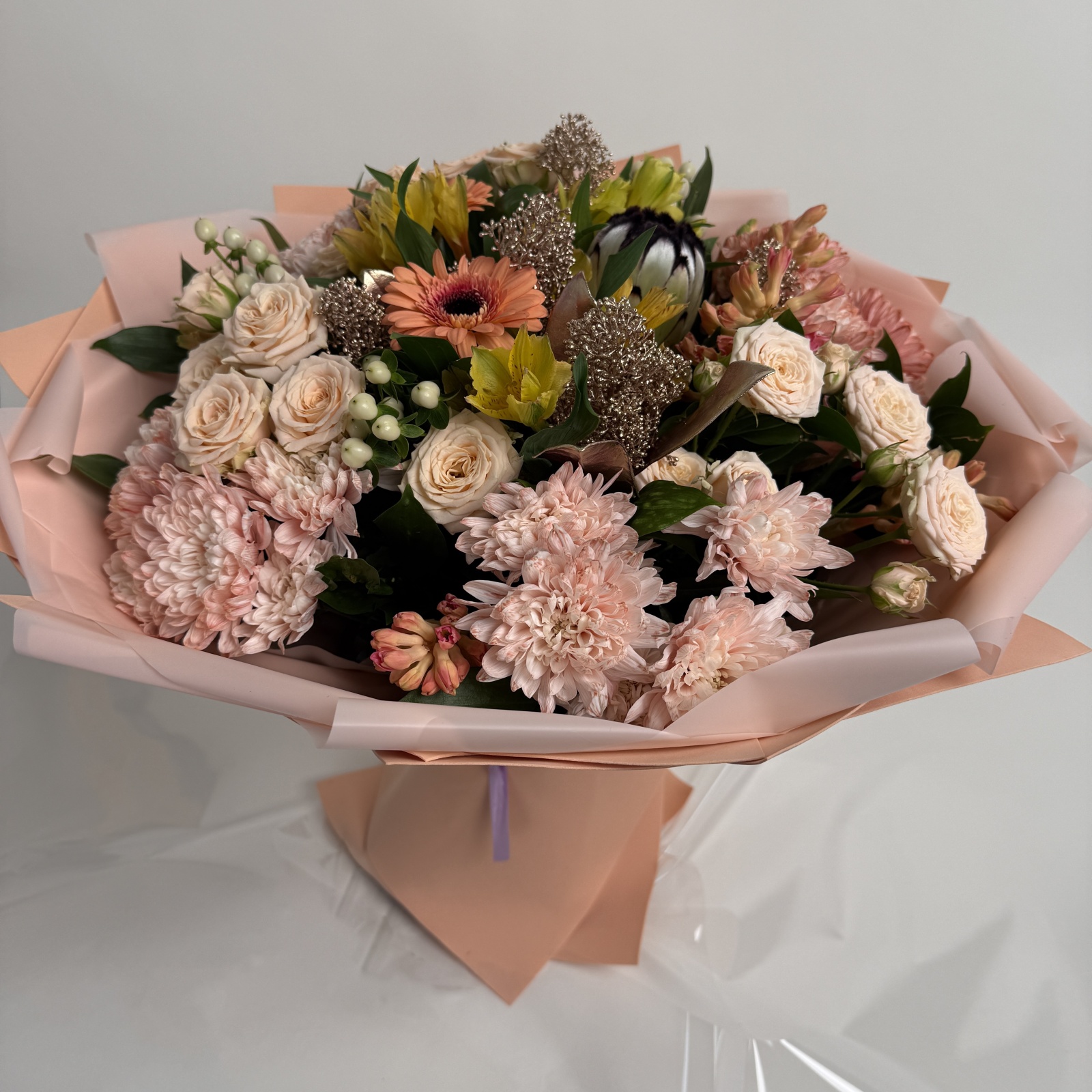 Состав: гиацинт 5, хризантема кустовая 5, альстромерия 3, роза кустовая 3, гиперикум 3, гербера 2 и прочее.