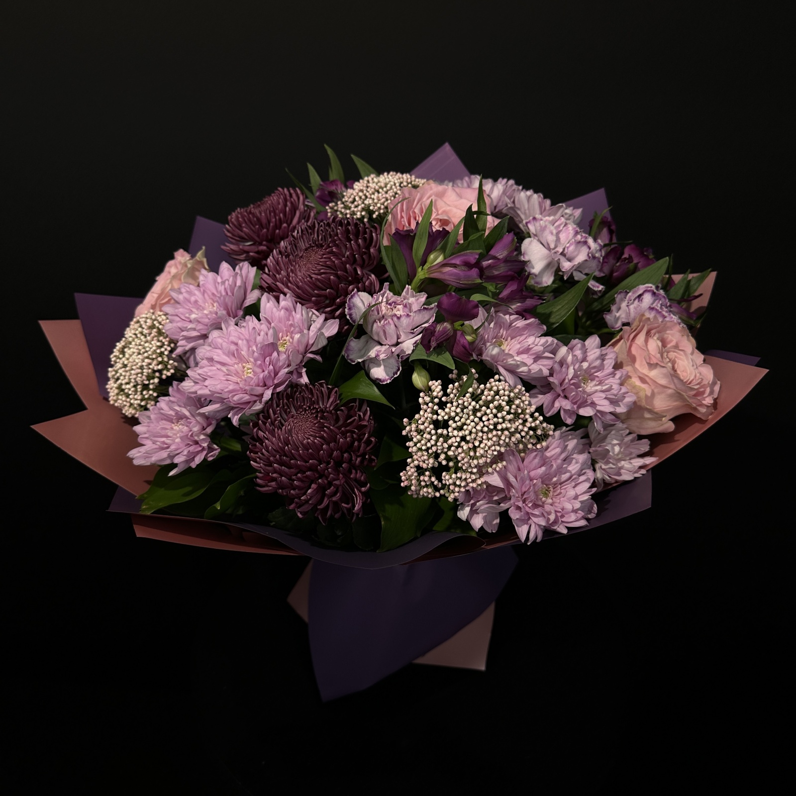 Состав: гвоздика 4, хризантема кустовая 3, хризантема 3, роза 3, альстромерия 3, рускус 1 и прочее. под заказ