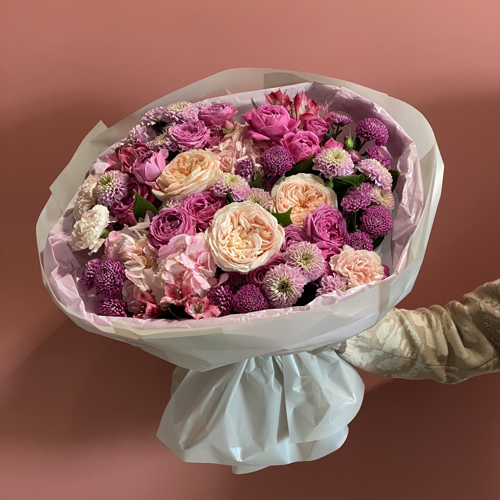 Состав: хризантема 5, хризантема кустовая 5, роза кустовая 4, роза 3, альстромерия 3, гвоздика 3, гортензия 2, рускус 0,6 и прочее. под заказ
