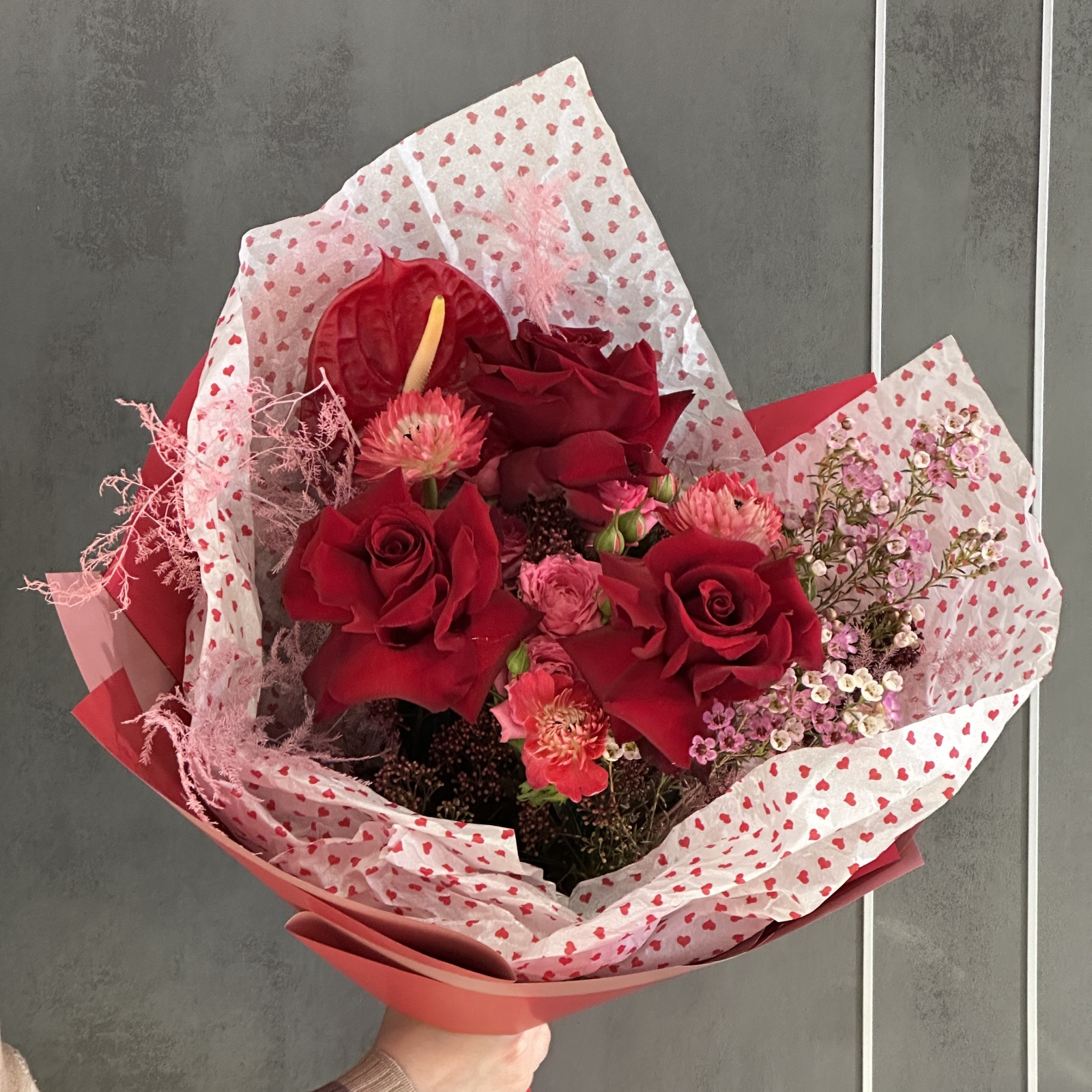 Состав: роза 3, анемон 3, роза кустовая 1 и прочее.