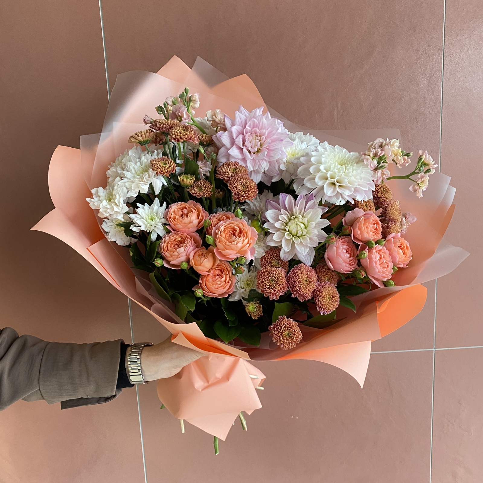 Состав: хризантема 4, хризантема кустовая 4, роза кустовая 2, маттиола 2, рускус 0,7 и прочее. под заказ