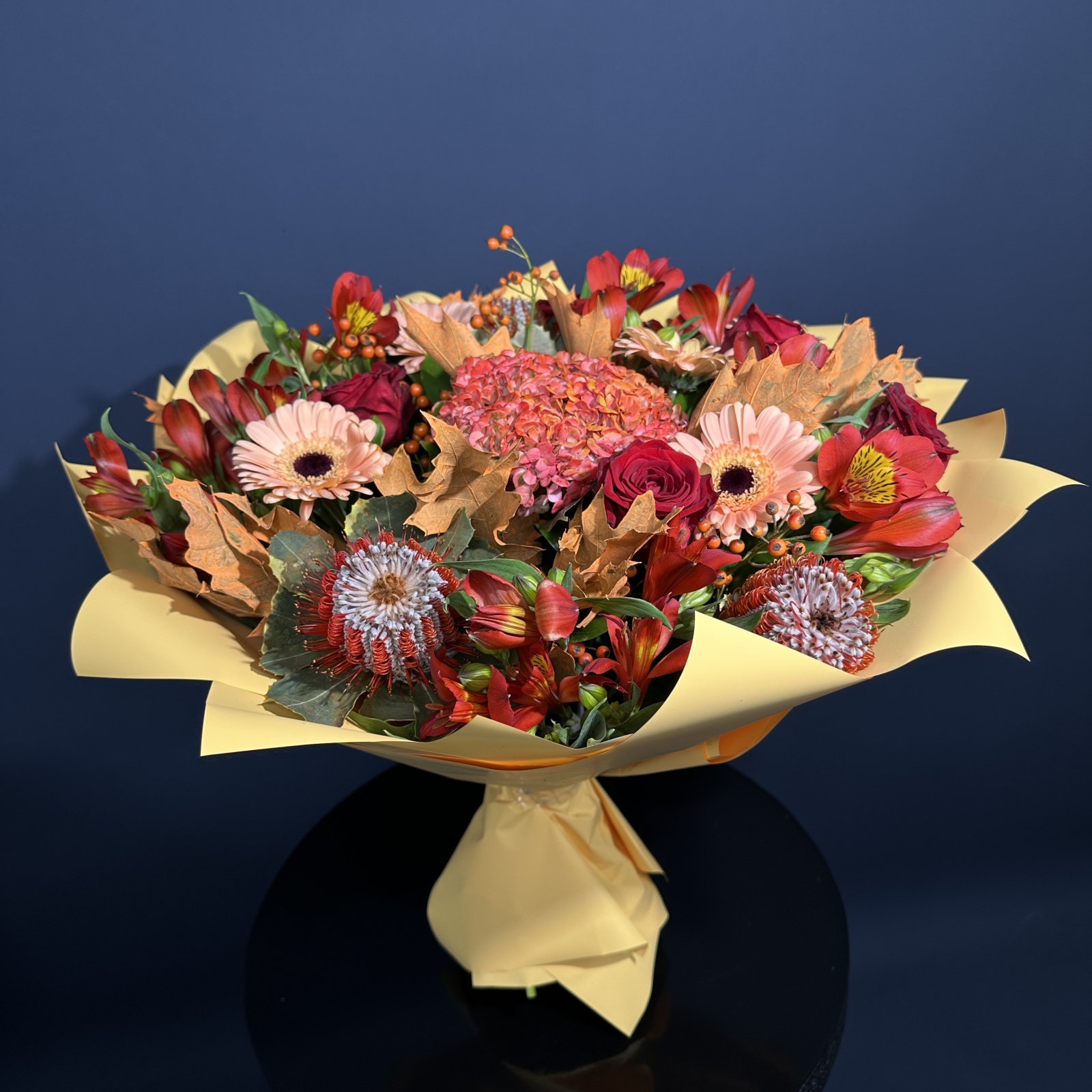 Состав: роза 5, альстромерия 5, гербера 5, гортензия 2, пион 1, рускус 0,5 и прочее.
