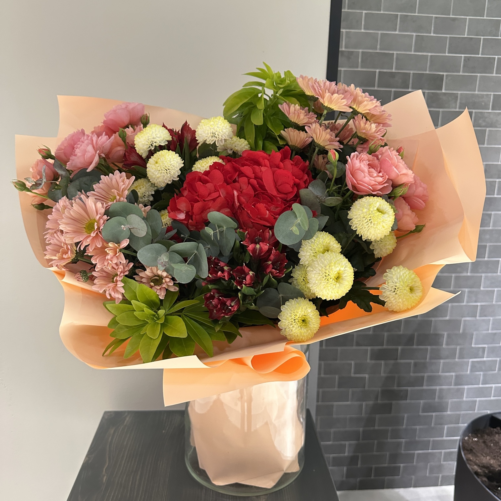Состав: хризантема кустовая 4, альстромерия 2, роза кустовая 2, эвкалипт 2, гортензия 1 и прочее. под заказ