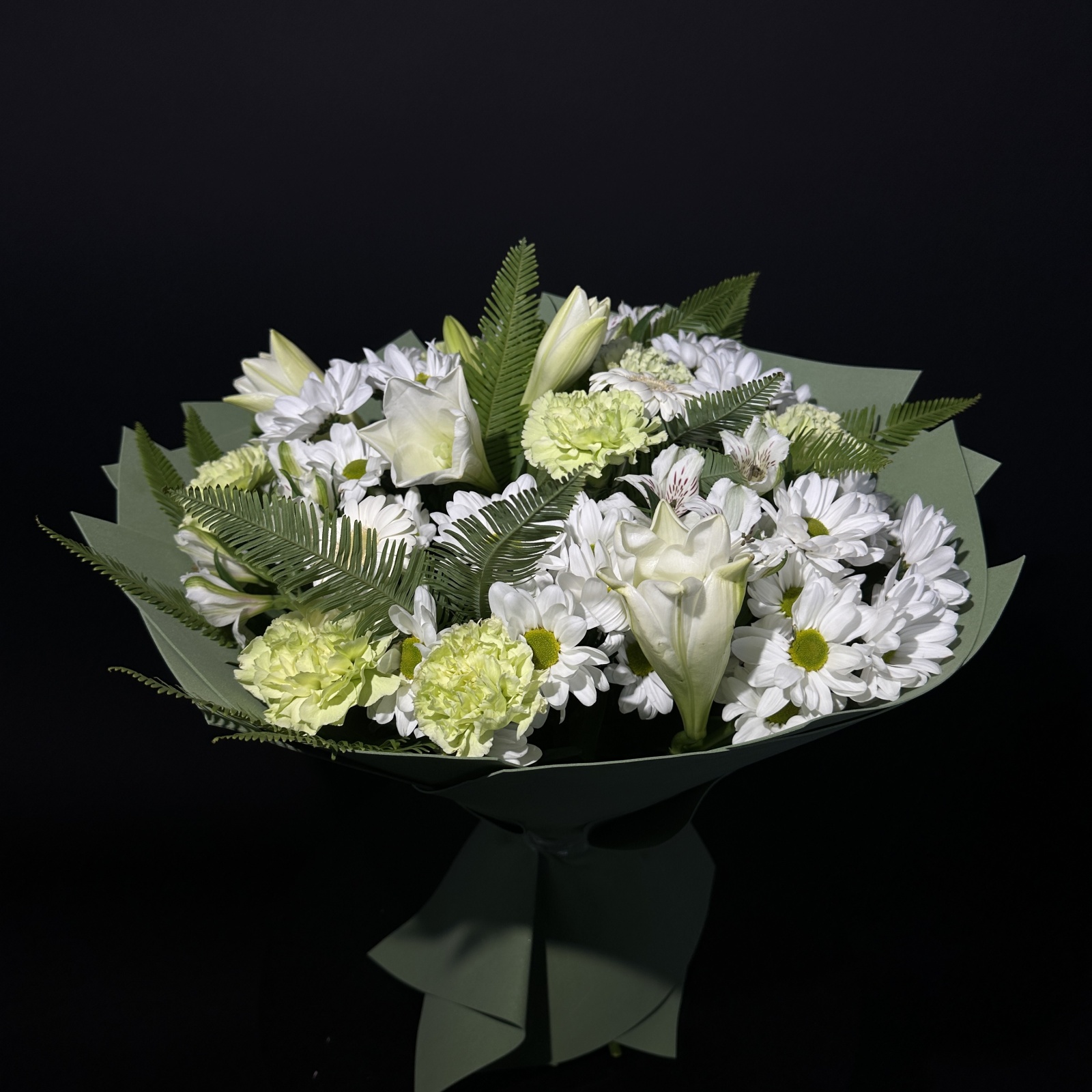 Состав: гвоздика 8, хризантема кустовая 4, гербера 3, альстромерия 3, лилия 3, гортензия 2, рускус 0,5 и прочее.