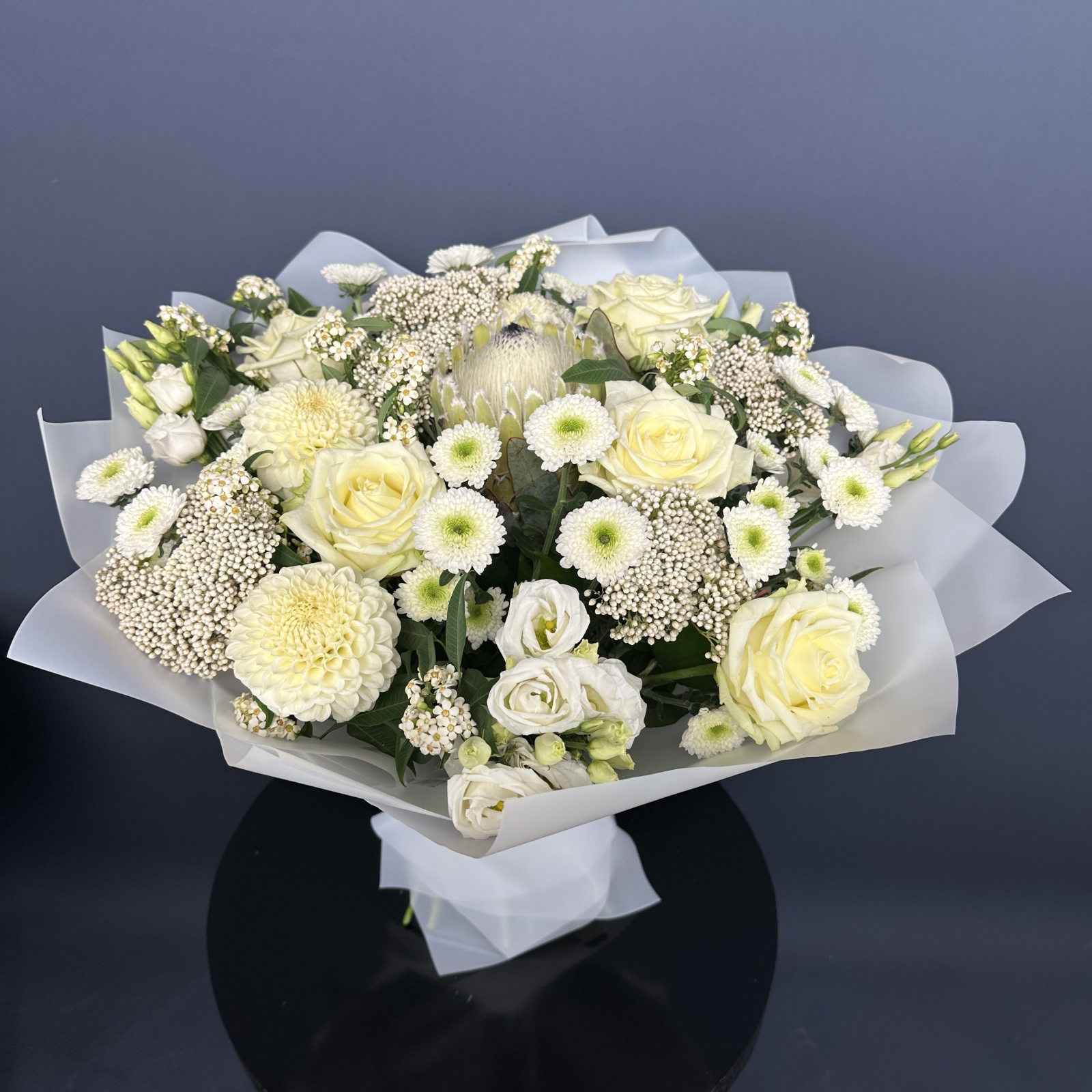 Состав: хризантема кустовая 6, роза 5, лизиантус 3, рускус 0,5 и прочее. под заказ
