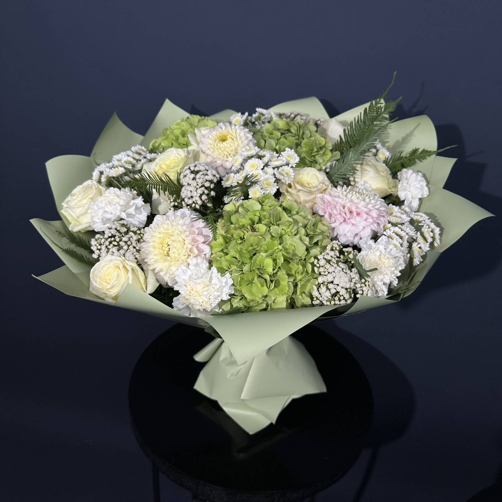 Состав: роза 7, гвоздика 5, хризантема кустовая 5, гортензия 3, рускус 0,5 и прочее. под заказ
