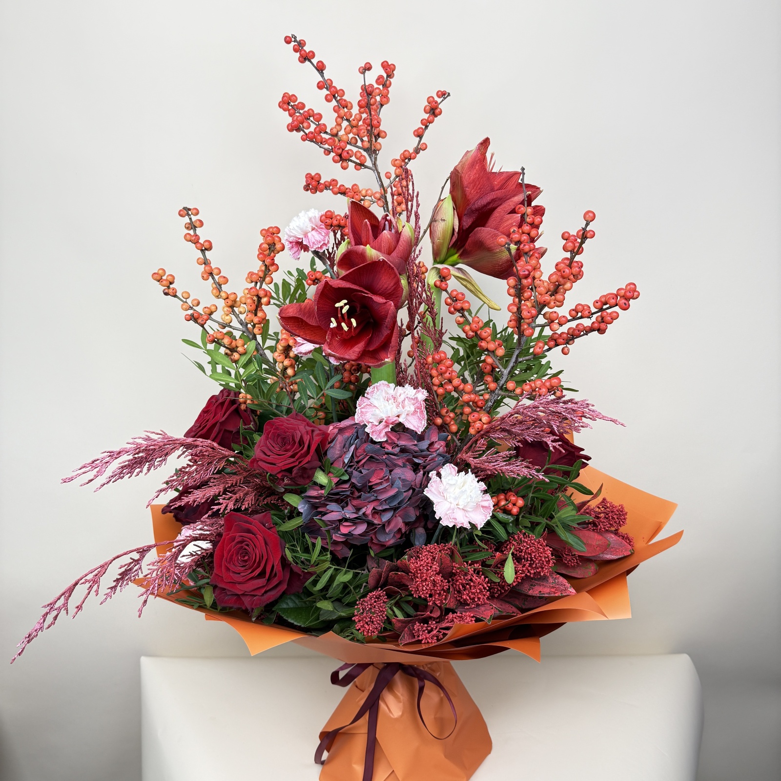 Состав: роза 5, гвоздика 5, гортензия 1, гиппеаструм 1, фисташка 1 и прочее. под заказ