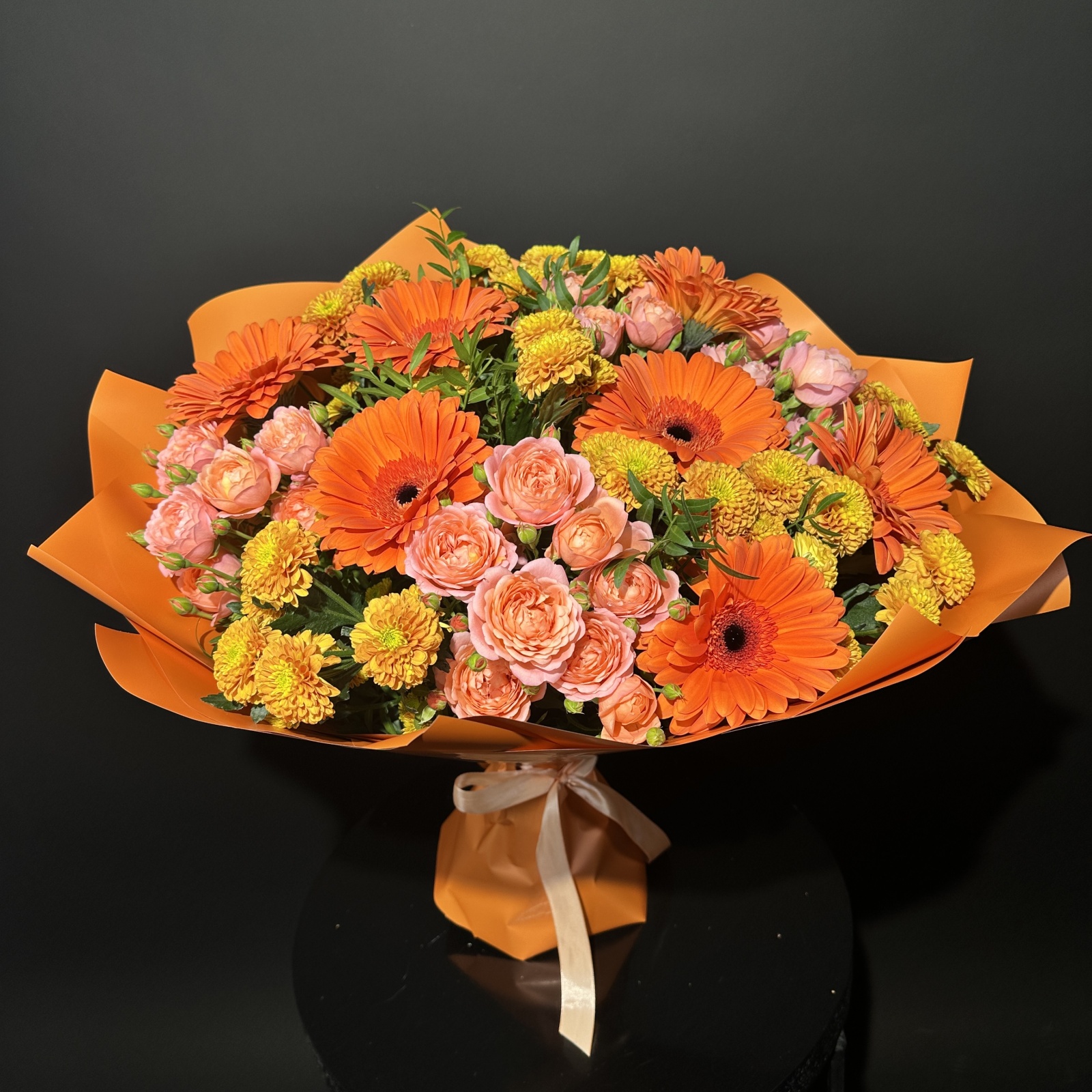 Состав: хризантема кустовая 8, гербера 7, роза кустовая 4, фисташка 0,8 и прочее. под заказ