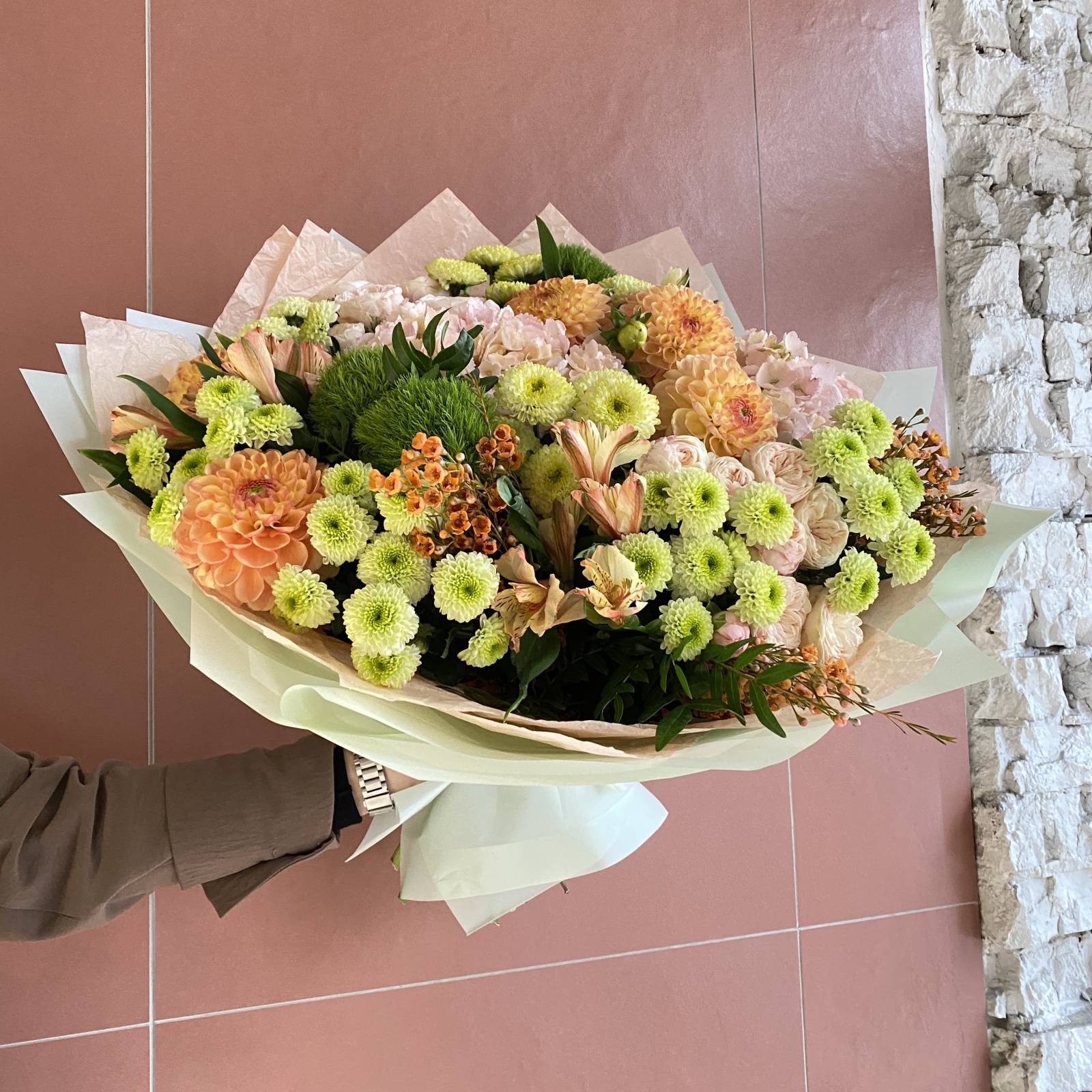 Состав: хризантема 6, альстромерия 3, гвоздика 3, роза кустовая 2, хризантема кустовая 2, гортензия 2, хамелациум 2, фисташка 1 и прочее. под заказ