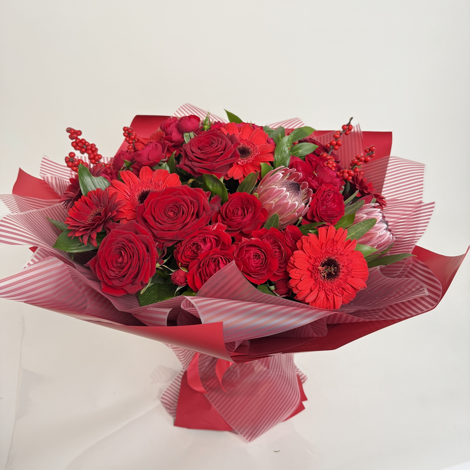 Состав: гербера 7, роза 5, роза кустовая 4, рускус 0,5 и прочее.