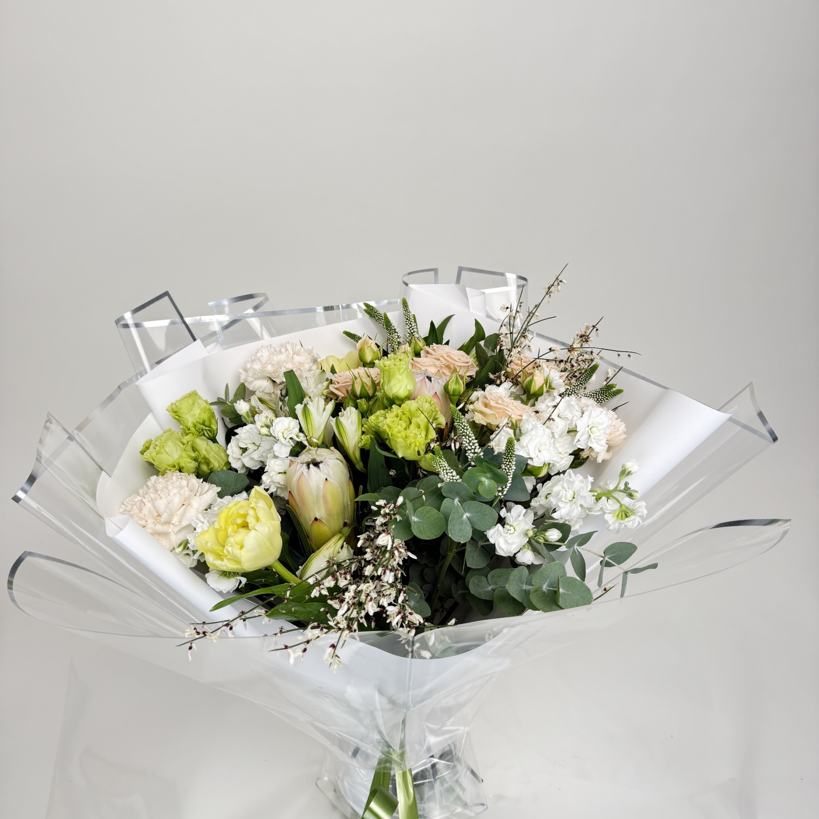 Состав: альстромерия 3, гвоздика 3, тюльпан 2, лизиантус 2, маттиола 2, эвкалипт 1, роза кустовая 1, гербера 1 и прочее. в наличии