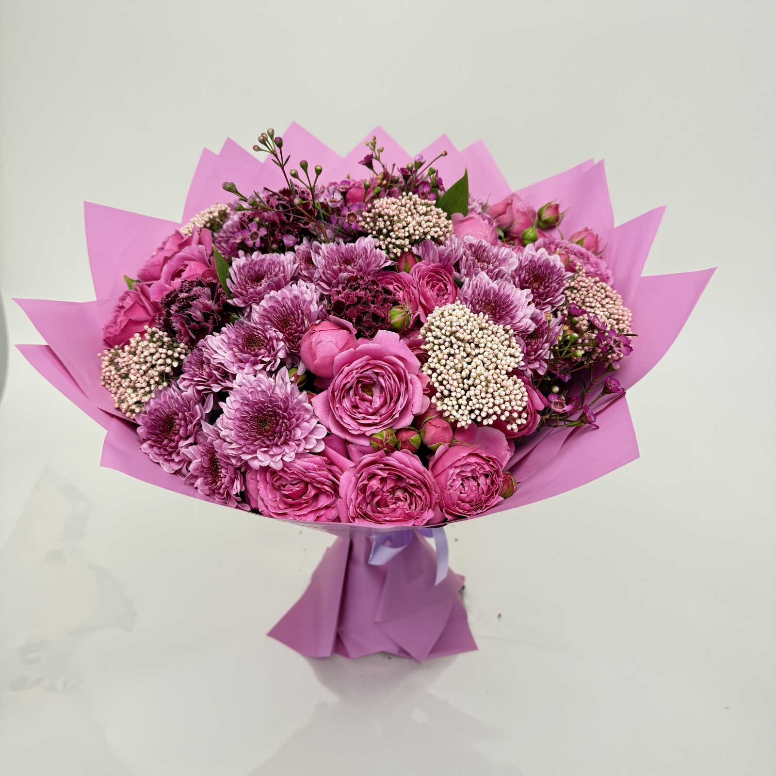 Состав: роза кустовая 5, хризантема кустовая 5, гвоздика 3 и прочее. под заказ