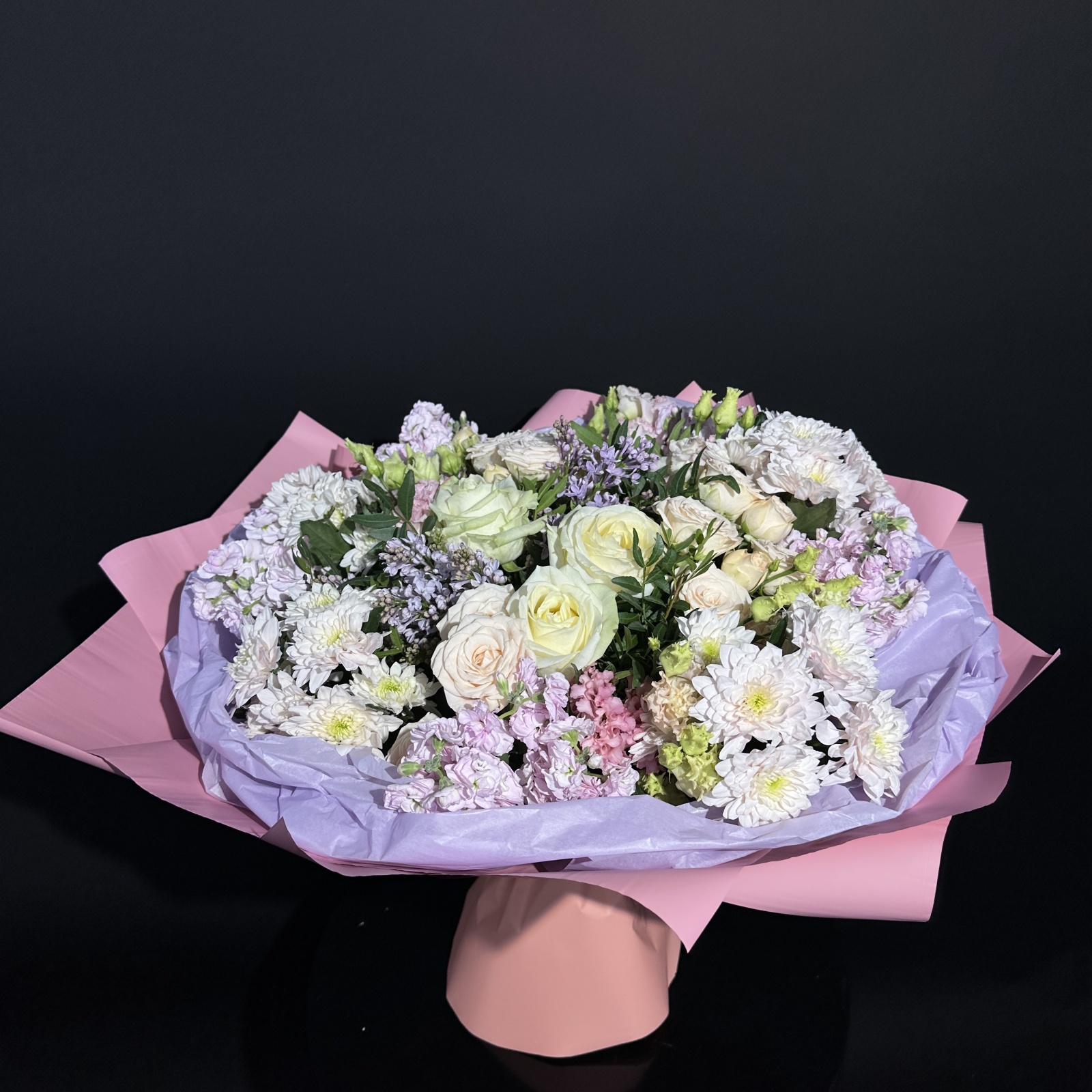 Состав: хризантема кустовая 4, маттиола 4, лизиантус 3, роза 3, роза кустовая 3, сирень 2, фисташка 1, анемон 1 и прочее. под заказ