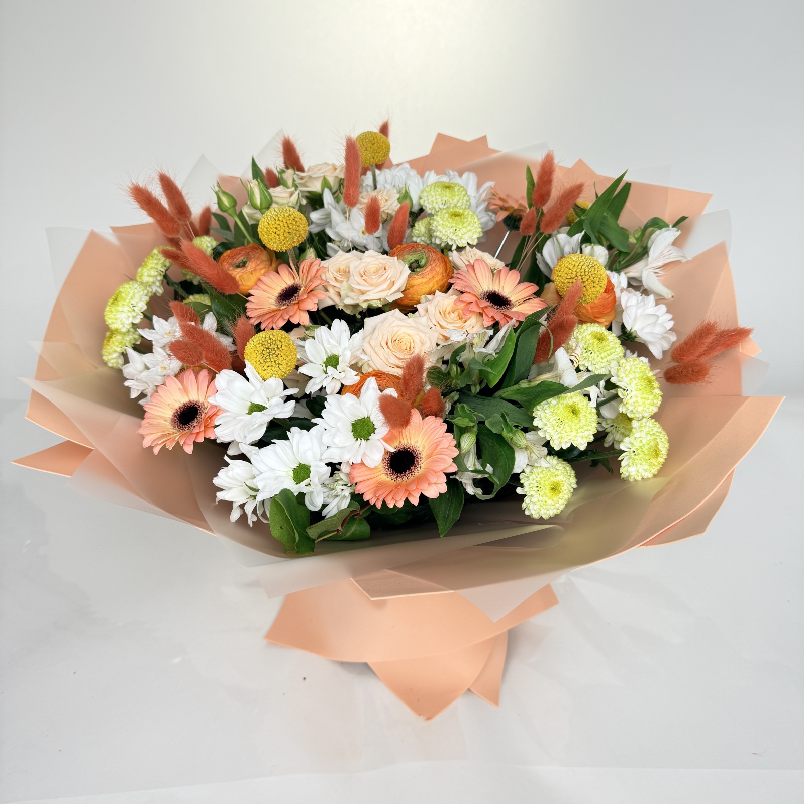 Состав: хризантема кустовая 6, гербера 5, ранункулюс 5, альстромерия 3, роза кустовая 2, салал 0,5 и прочее. под заказ