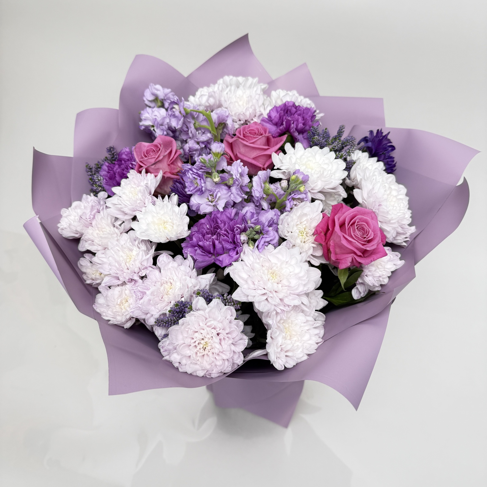 Состав: хризантема кустовая 10, анемон 3, роза 3, гвоздика 3, маттиола 2 и прочее.