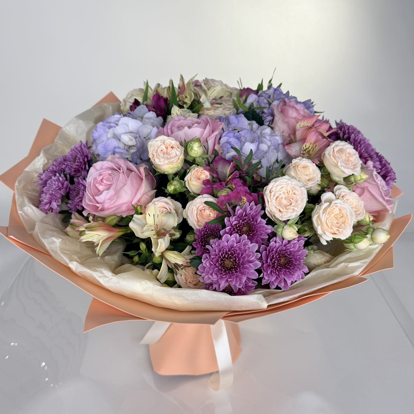 Состав: альстромерия 6, роза 5, роза кустовая 4, гортензия 4, хризантема кустовая 3, фисташка 1 и прочее. в наличии