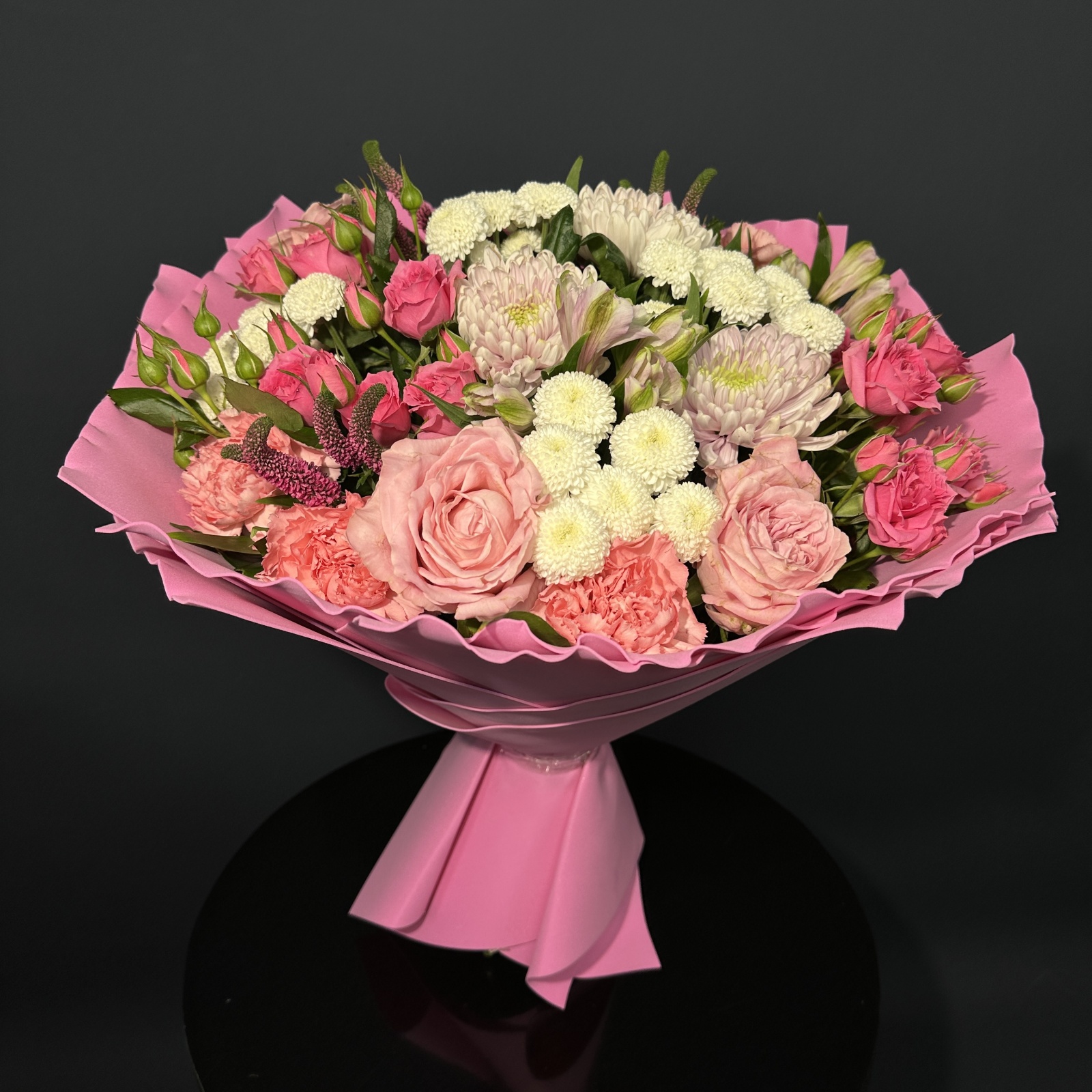 Состав: гвоздика 4, хризантема кустовая 4, роза кустовая 3, хризантема 3, роза 3, альстромерия 3, рускус 1 и прочее.