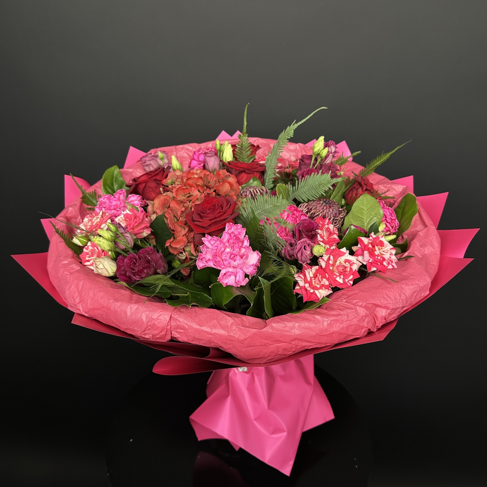 Состав: роза 5, гвоздика 5, лизиантус 3, роза кустовая 1, гортензия 1, салал 0,7 и прочее. в наличии