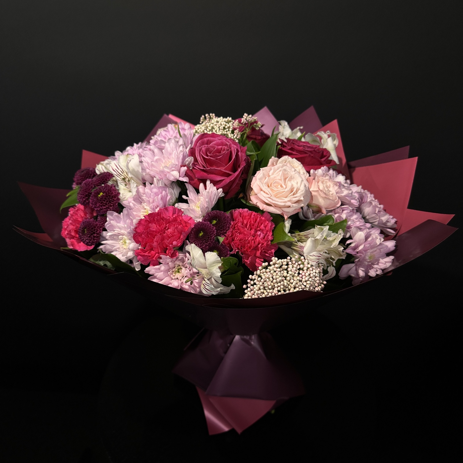 Состав: хризантема 4, роза 3, альстромерия 3, гвоздика 3, хризантема кустовая 3, роза кустовая 2, рускус 0,8 и прочее.