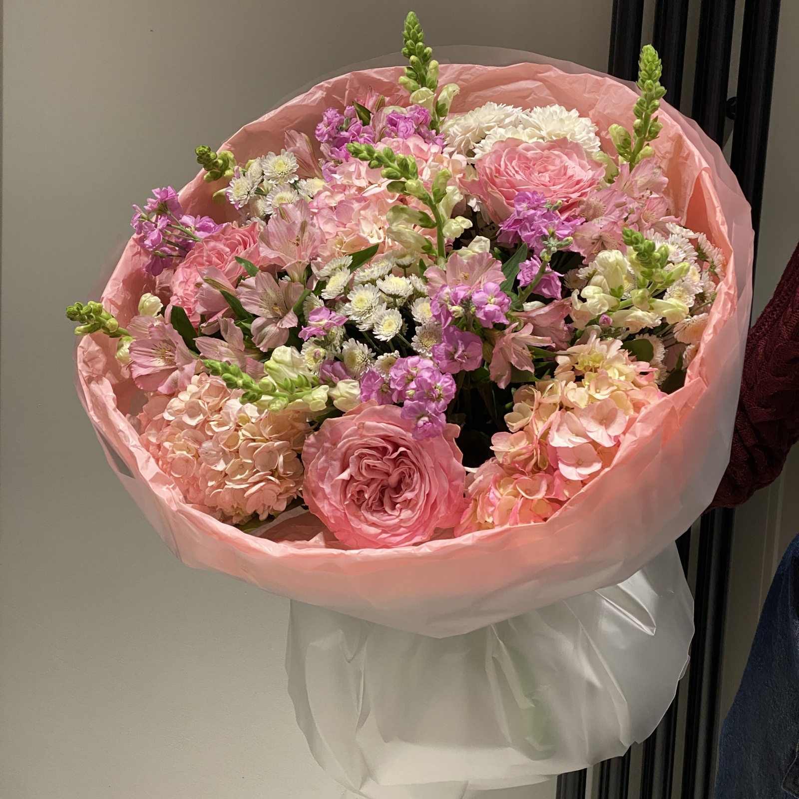 Состав: антирринум 7, альстромерия 5, хризантема кустовая 4, маттиола 4, роза 3, гортензия 3, рускус 1 и прочее.