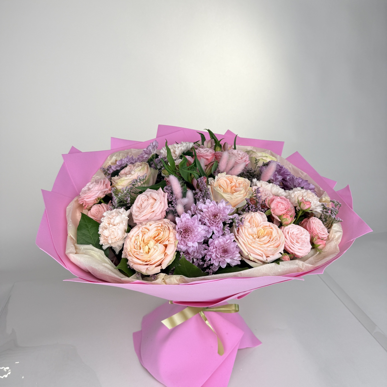 Состав: гвоздика 8, роза 5, роза кустовая 3, хризантема кустовая 3, альстромерия 2, лимониум 2, гербера 1, салал 0,5 и прочее. под заказ