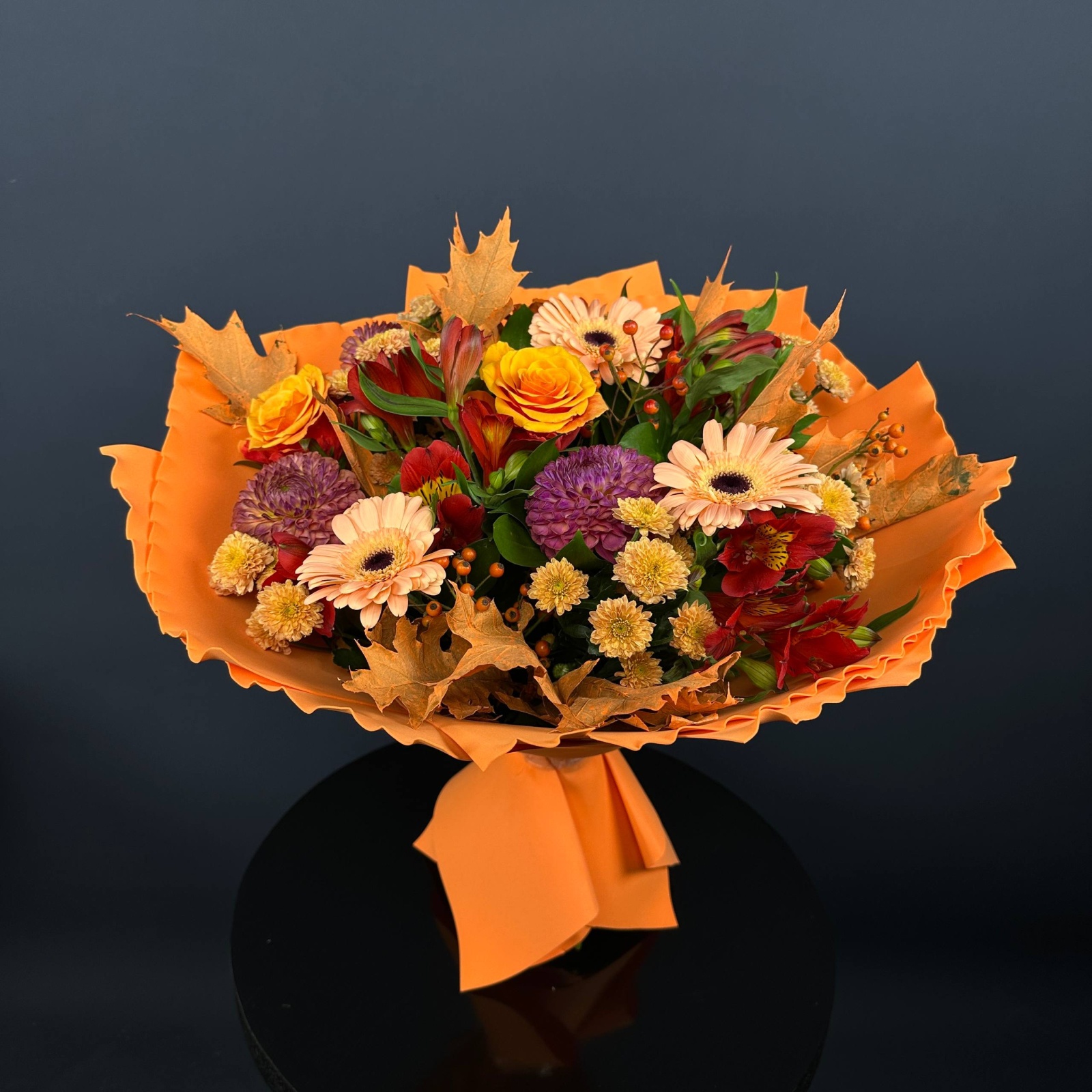Состав: хризантема кустовая 7, гербера 3, роза 3, альстромерия 3, рускус 1 и прочее.