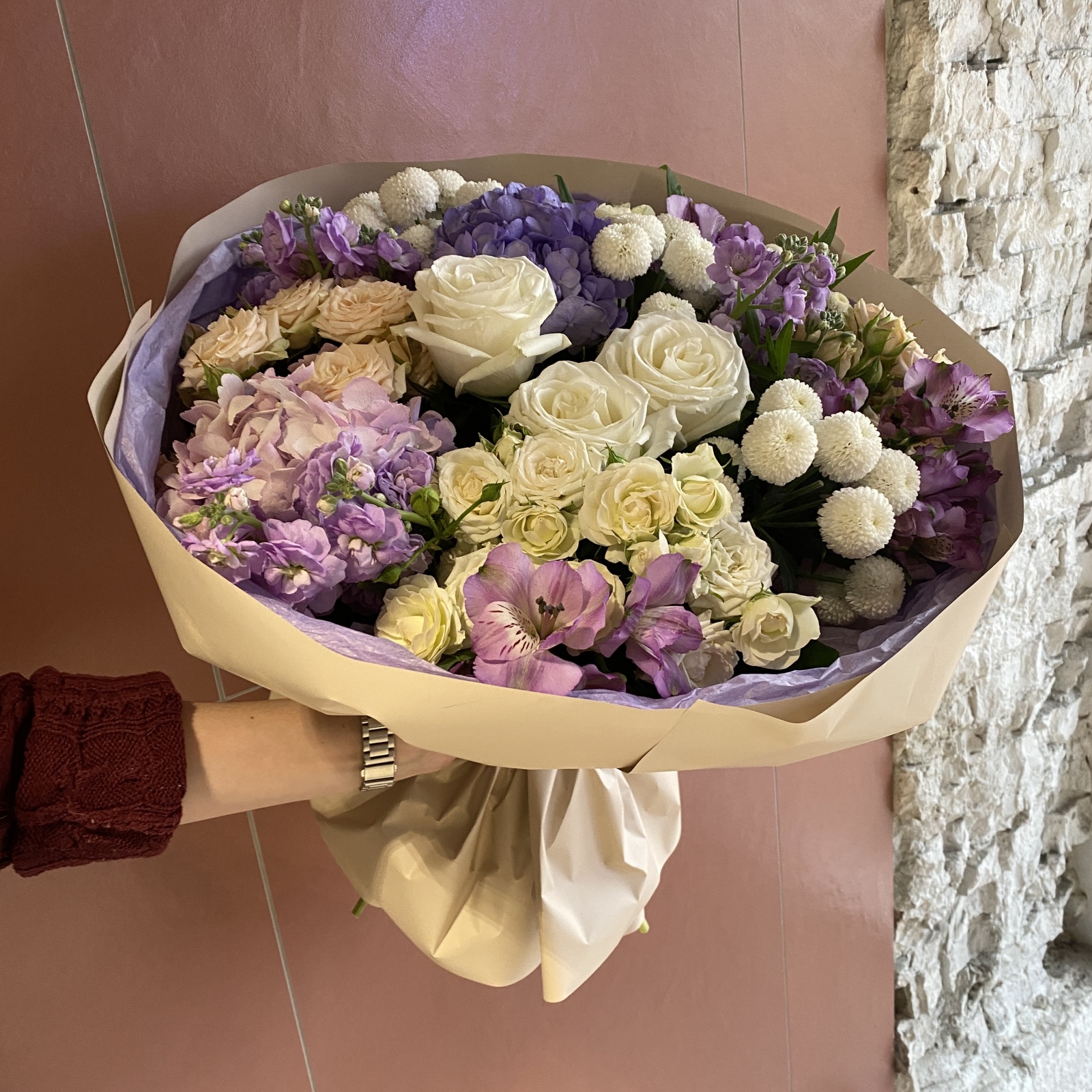 Состав: роза кустовая 4, хризантема кустовая 4, роза 3, альстромерия 3, маттиола 3, гортензия 2, фисташка 0,6, рускус 0,3 и прочее.