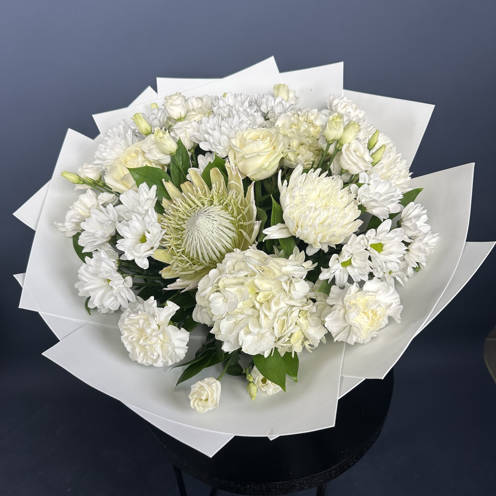 Состав: хризантема кустовая 5, гвоздика 4, роза 4, хризантема 3, лизиантус 2, гортензия 2, рускус 1 и прочее.