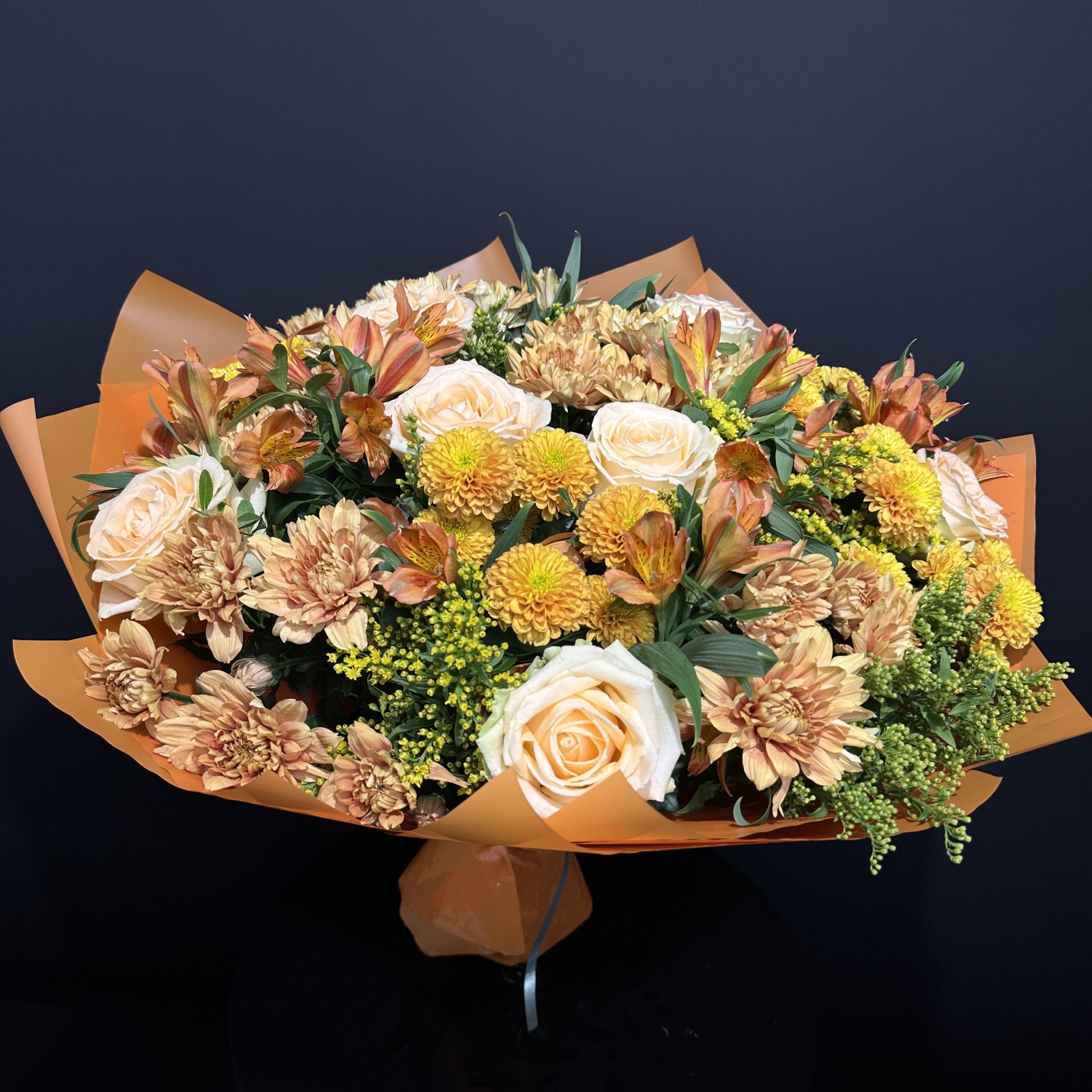 Состав: хризантема кустовая 9, роза 7, альстромерия 7, солидаго 5, фисташка 0,4 и прочее. под заказ