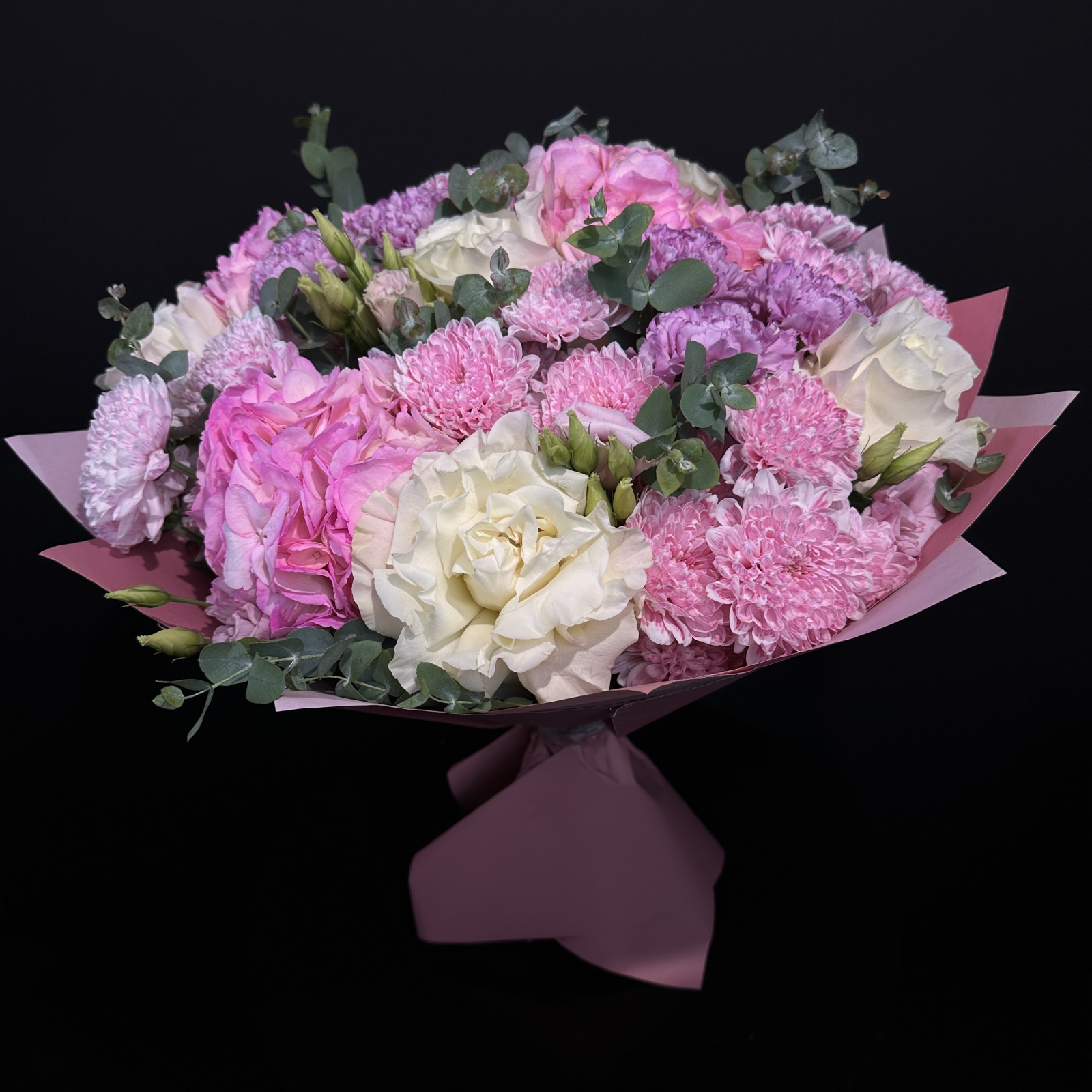 Состав: гвоздика 5, хризантема кустовая 5, роза 4, гортензия 3, лизиантус 2, эвкалипт 2 и прочее.