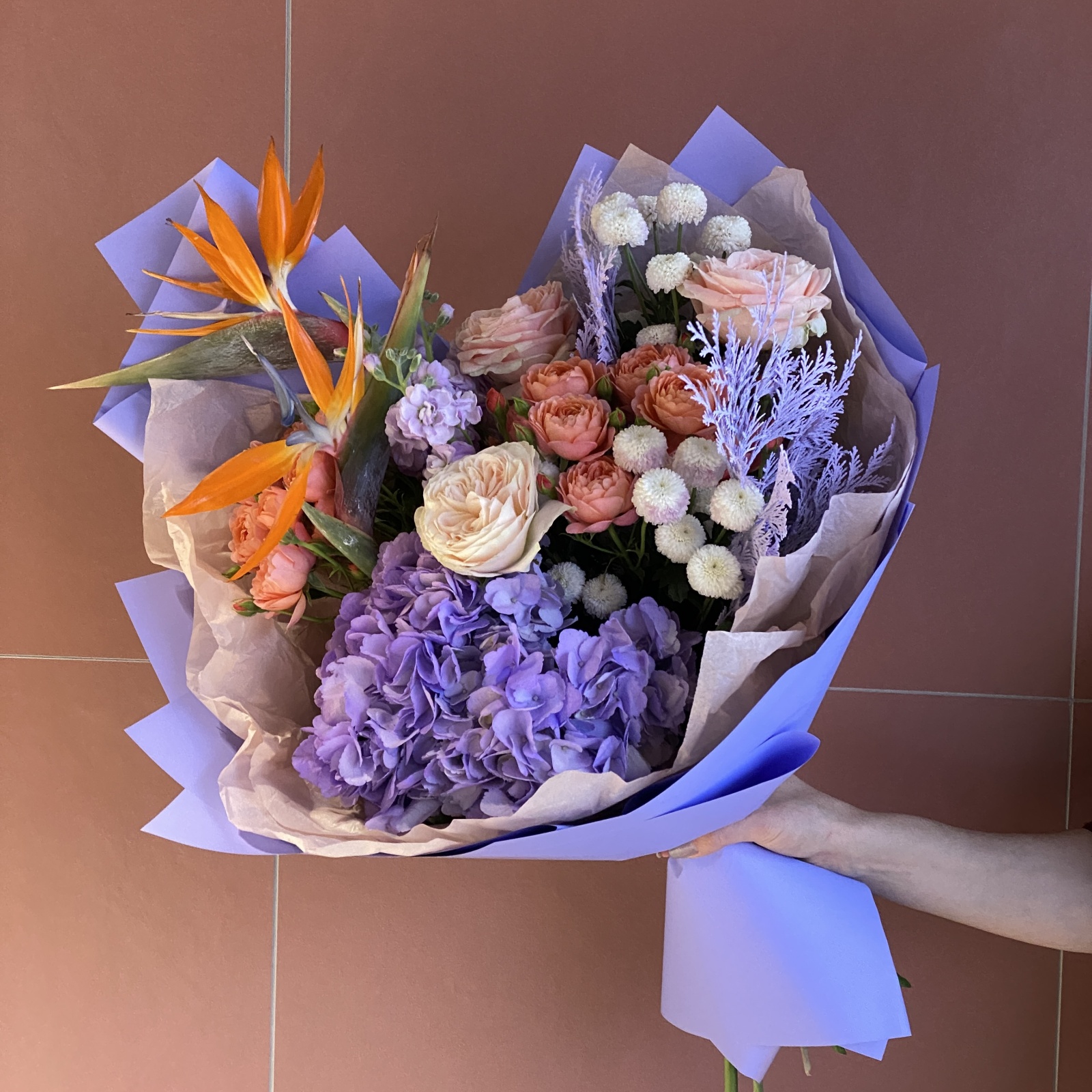 Состав: роза 3, хризантема кустовая 3, роза кустовая 2, гортензия 1, маттиола 1, рускус 0,5 и прочее. под заказ