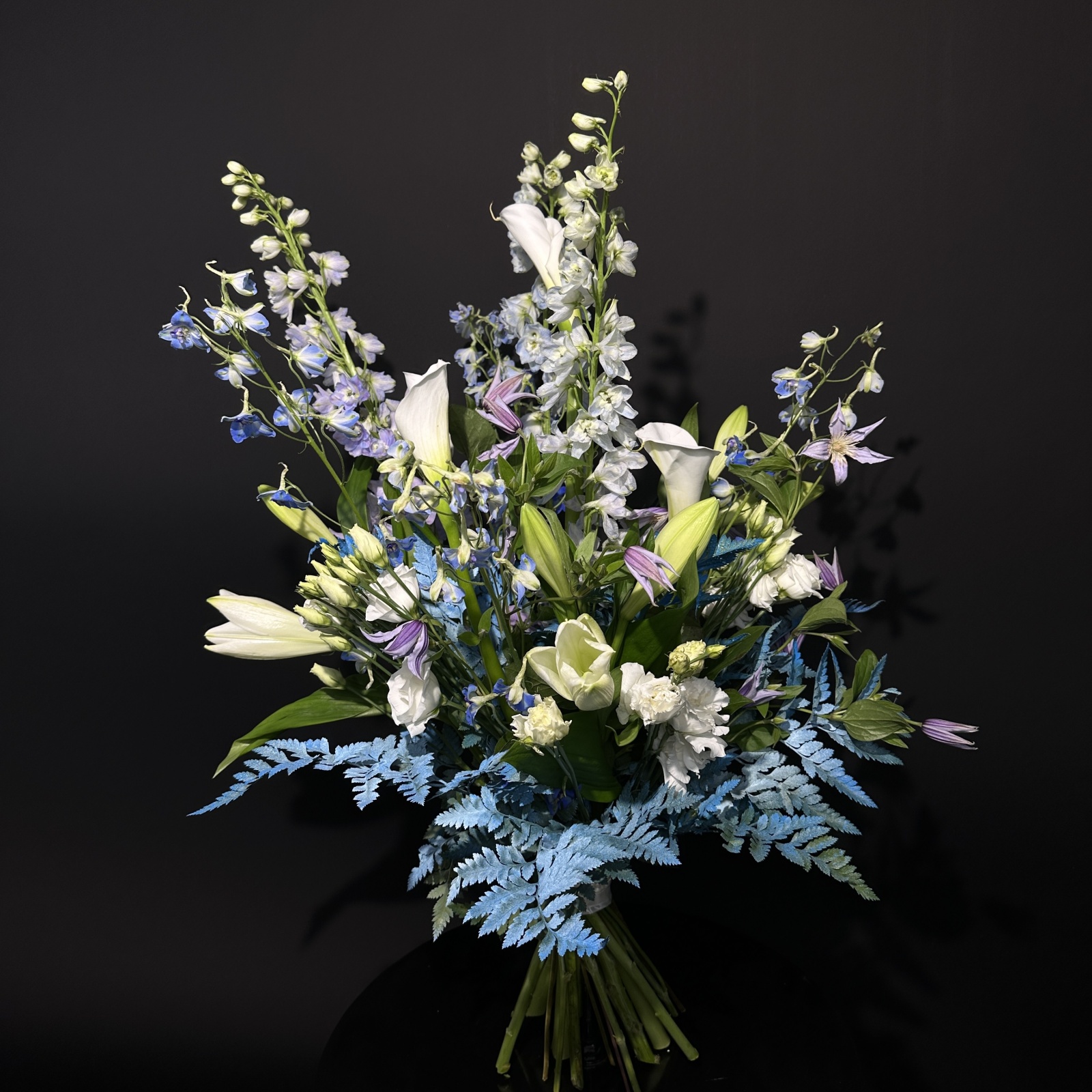 Состав: дельфиниум 7, клематис 4, лизиантус 4, лилия 3, папоротник 0,5 и прочее. в наличии