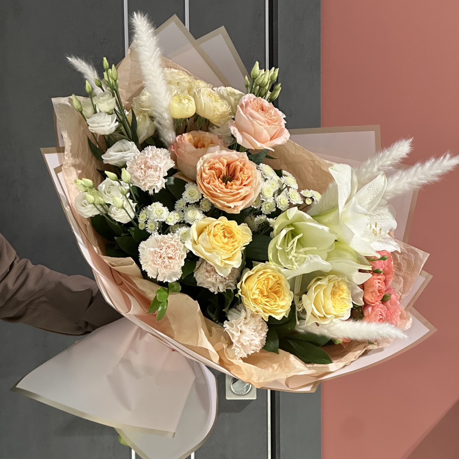 Состав: гвоздика 5, хризантема кустовая 3, роза 3, лизиантус 3, роза кустовая 2, рускус 0,5 и прочее.