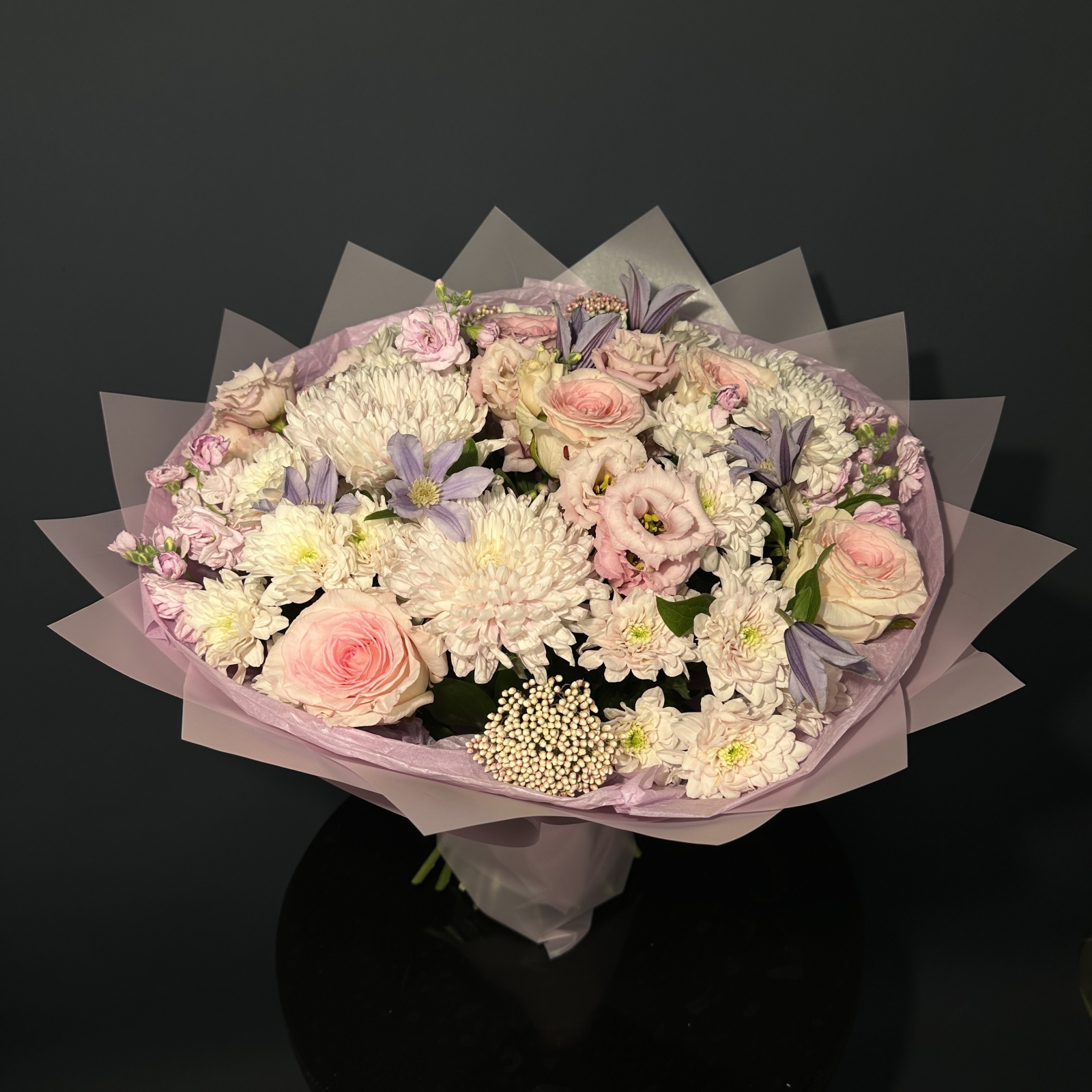 Состав: роза 5, хризантема кустовая 5, гвоздика 4, клематис 3, лизиантус 3, маттиола 3, хризантема 3, рускус 0,5 и прочее.