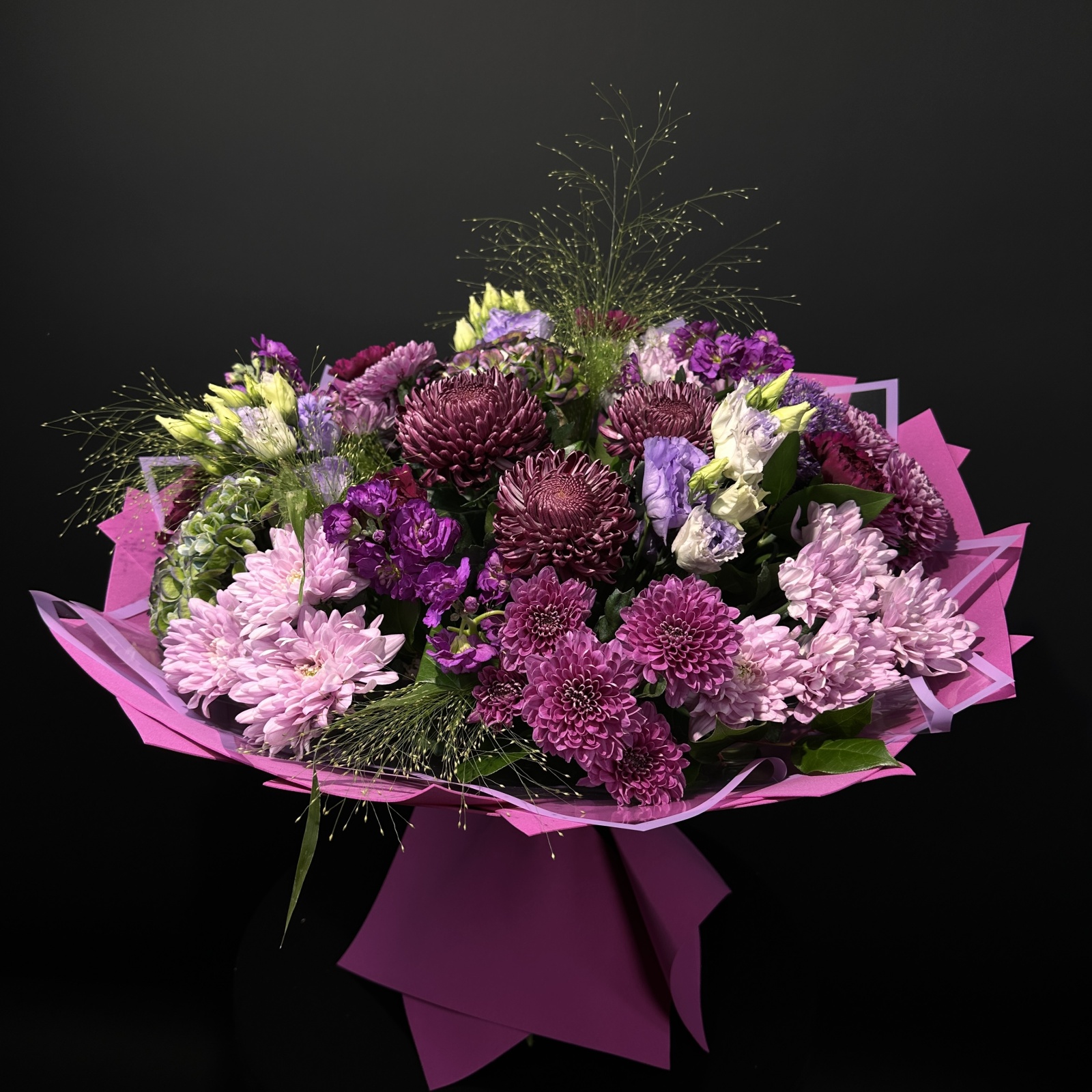 Состав: хризантема кустовая 5,5, гвоздика 5, хризантема 3, гортензия 3, лизиантус 3, маттиола 3, салал 0,5 и прочее.