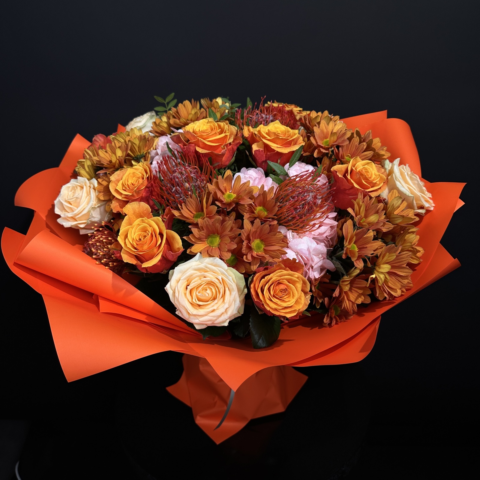 Состав: роза 12, хризантема кустовая 5, гвоздика 3, гортензия 2, фисташка 1 и прочее.