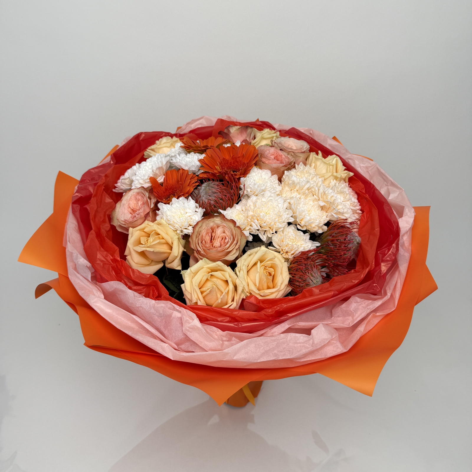 Состав: роза 11, хризантема кустовая 5, гербера 3 и прочее.