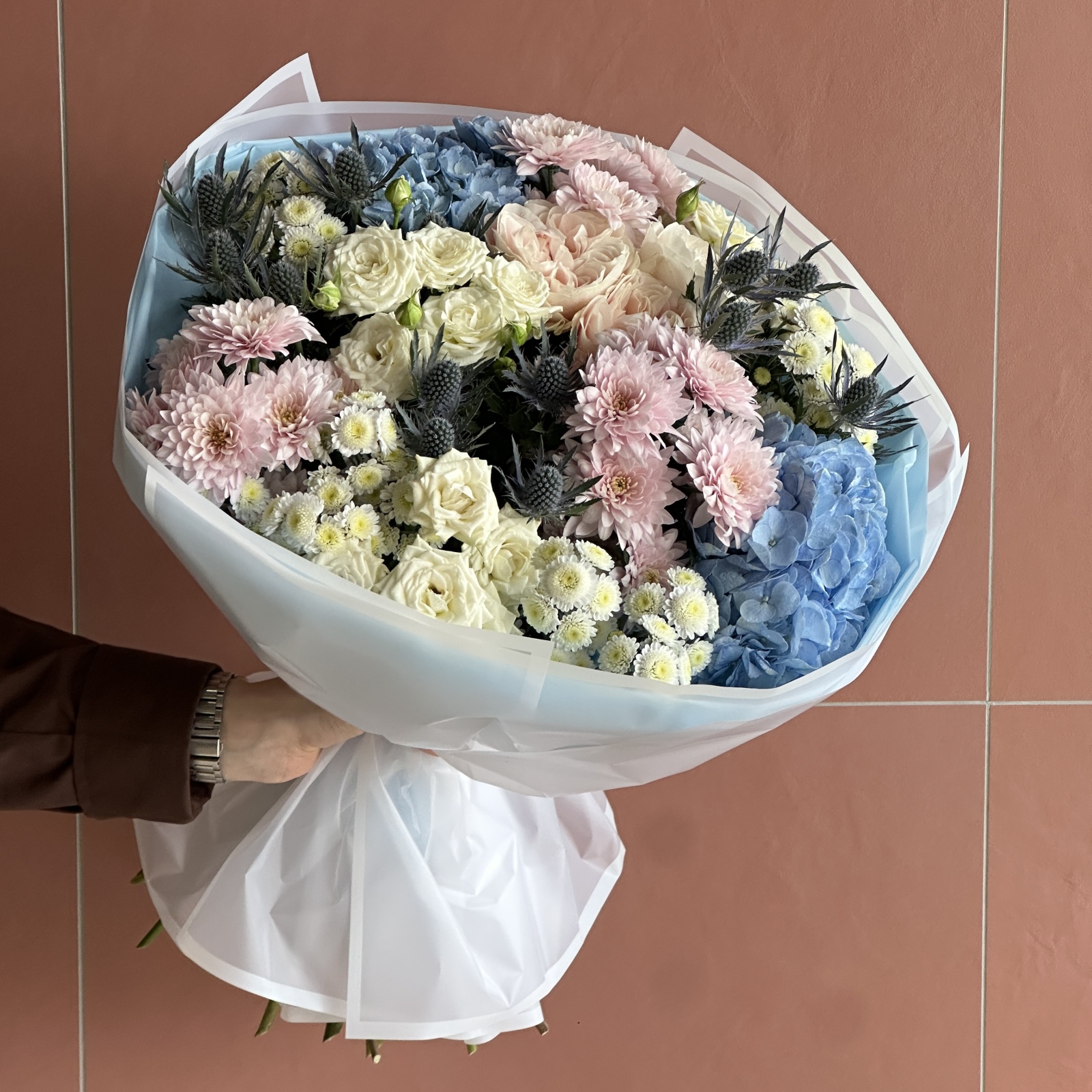 Состав: хризантема кустовая 7, роза 3, роза кустовая 3, эрингиум 3, гортензия 2, фисташка 1 и прочее.