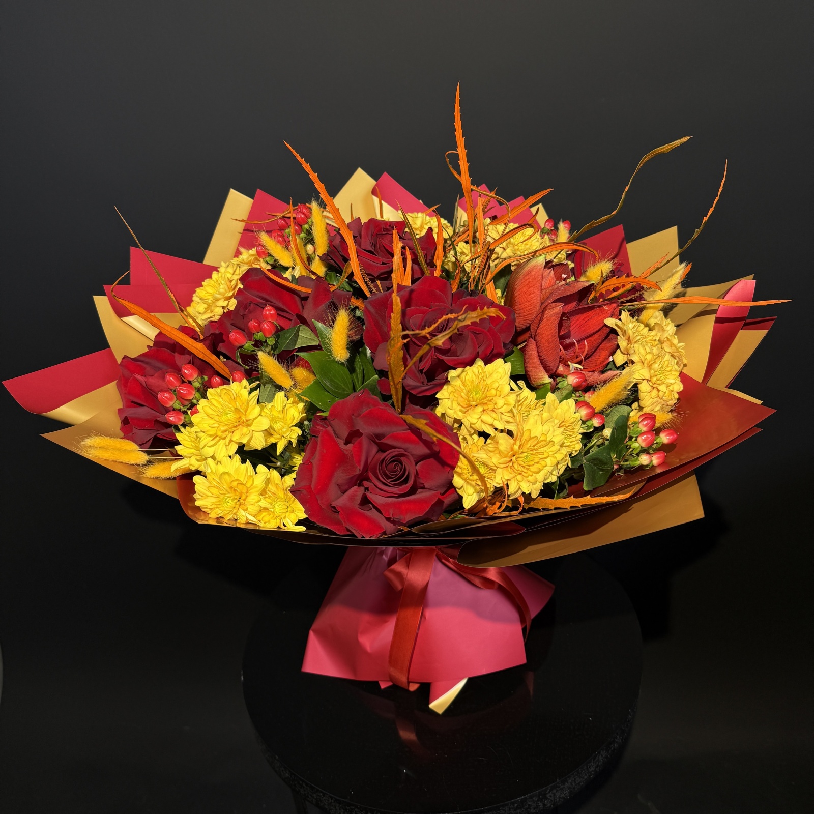 Состав: роза 7, хризантема кустовая 6, гиперикум 4, рускус 0,6 и прочее. под заказ