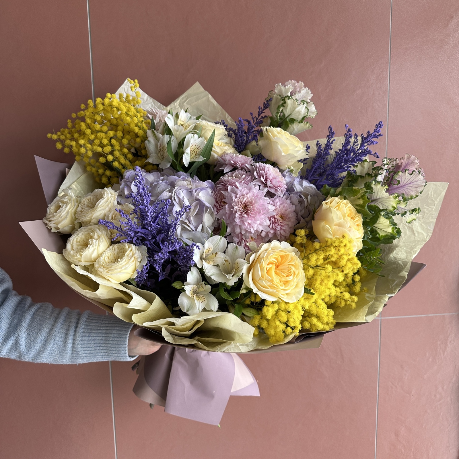 Состав: роза 3, солидаго 3, альстромерия 2, роза кустовая 2, хризантема кустовая 2, гортензия 2, фисташка 1 и прочее. под заказ